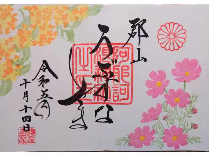 毎月定例の家内と二人での参拝です。 拝殿前の飾りも秋桜・🎑で秋らしくなってました。秋詣ですね。いつも優しい宮司様の奥様と少し談笑し素晴らしい御朱印を二枚頂きました。また来月が楽しみです。