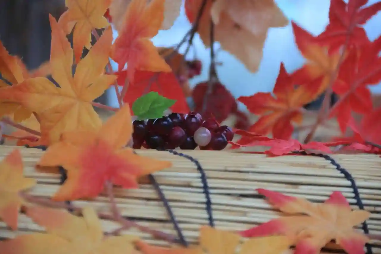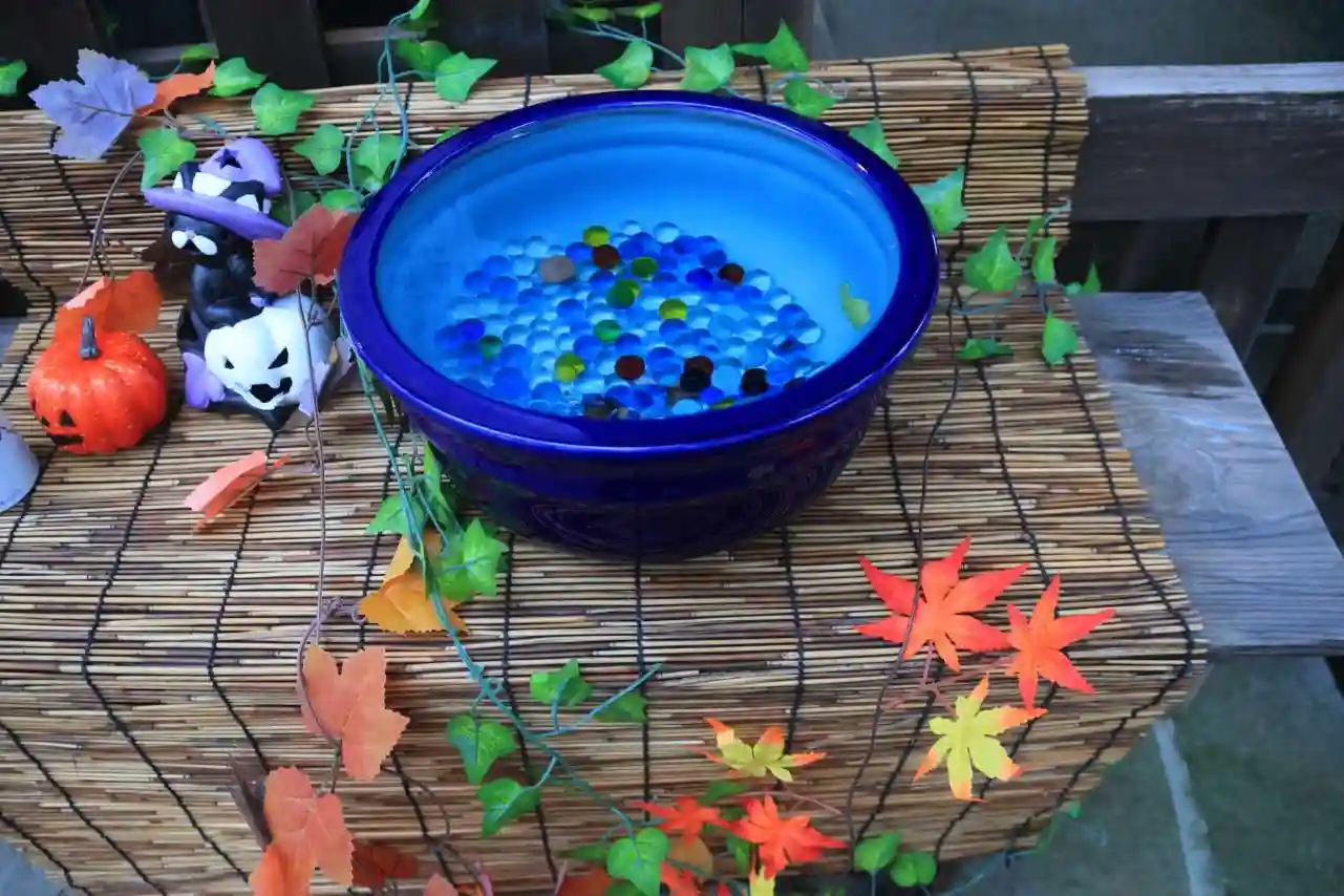 手水舎、拝殿前には秋の装いの飾りつけが