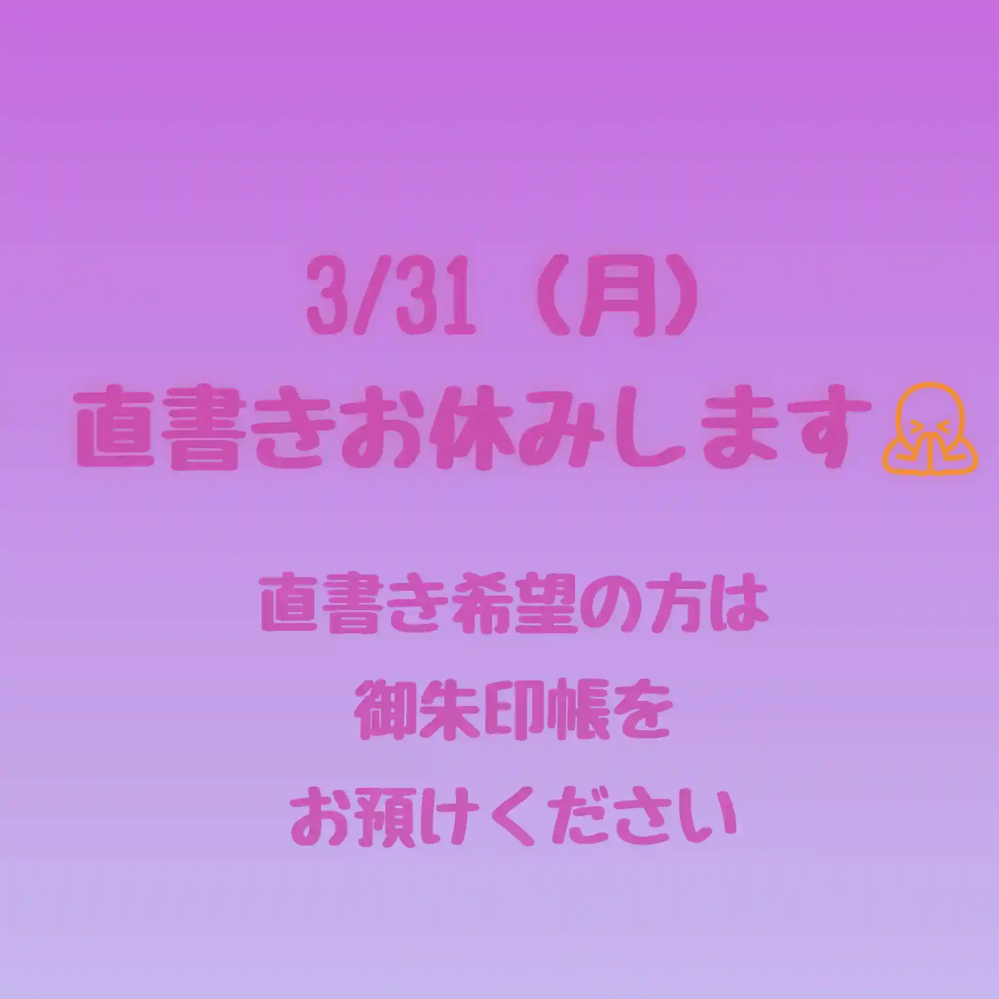 諸事情により3/31(月)は御朱印直書きお休みとさせていただきます🙇