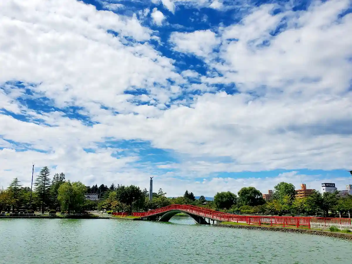 開成山公園の赤い橋、空の雲と池と橋(*^-^*)