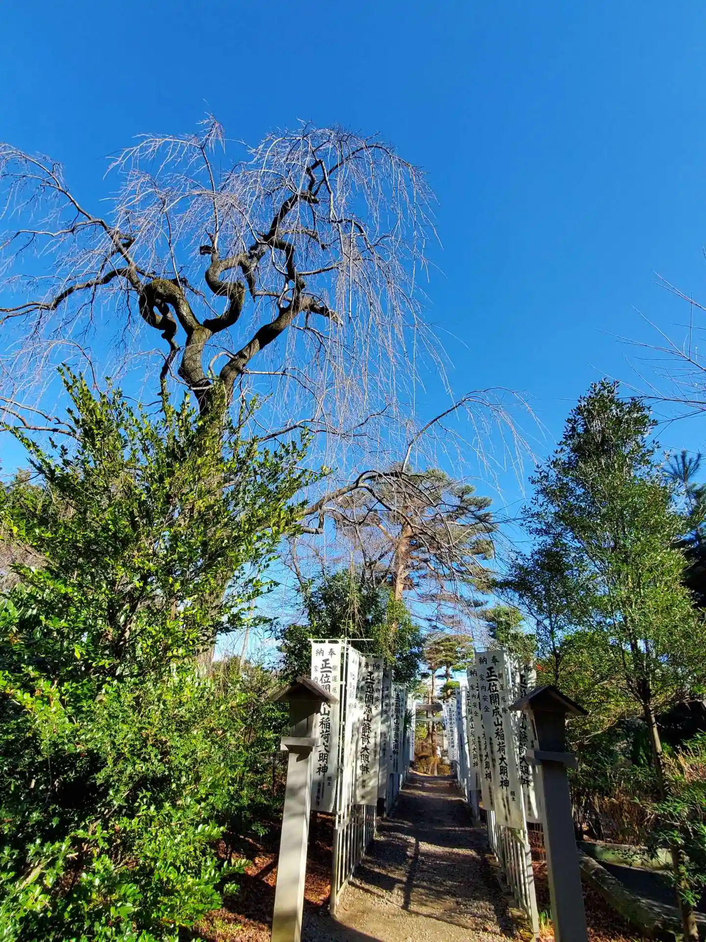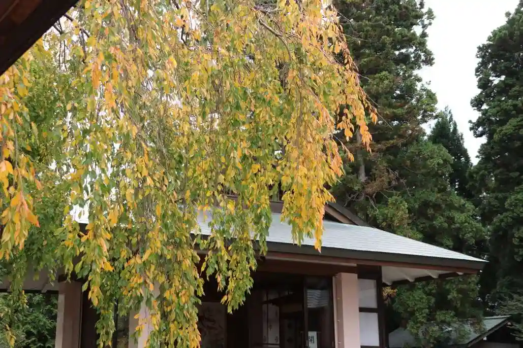 境内のしだれ桜が黄色く紅葉、参道…