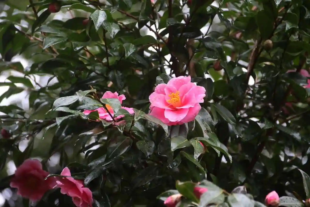 境内のピンクの椿が