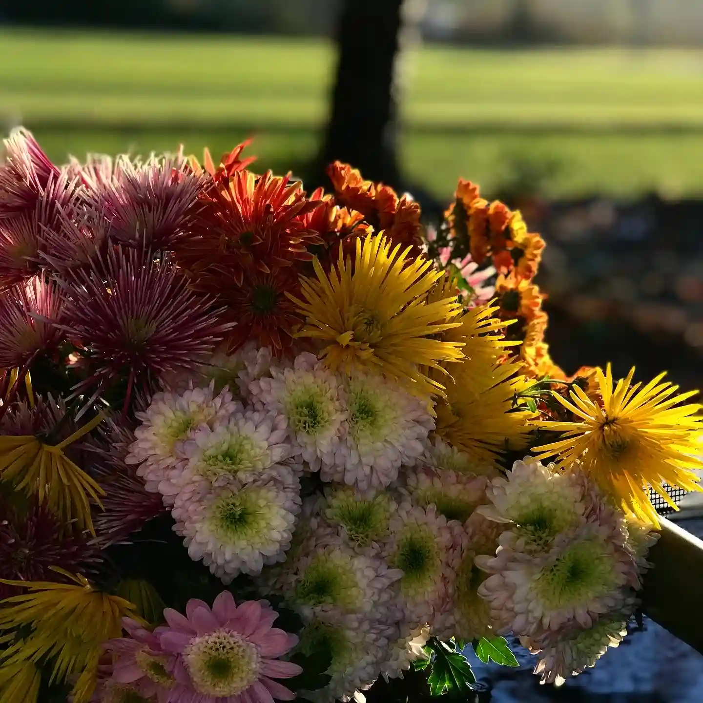 朝の菊も落ち葉も秋の景色で綺麗ですね🤗🍁🍂