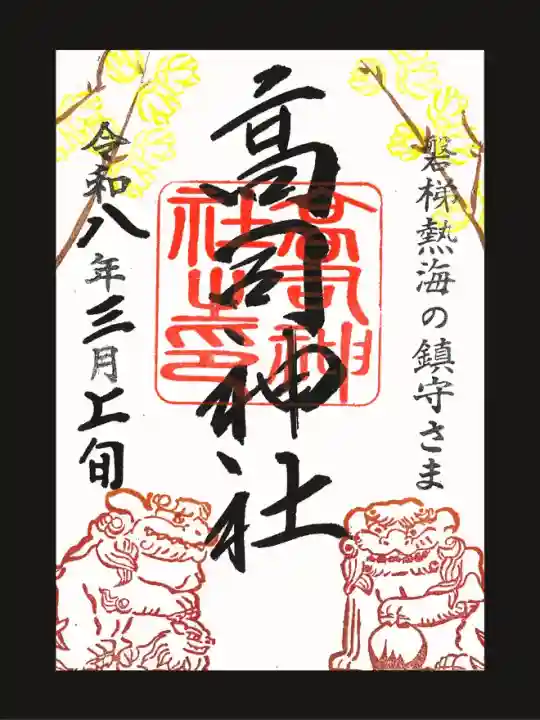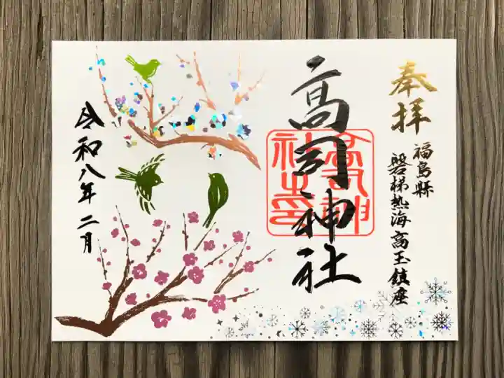 御朱印の絵柄は「神社境内にちなんだもの」をモチーフに神職が全て考案・奉製しています。参拝された時期や風景など、その月の中でも「変化する御朱印」をお分けしています。小さな村の鎮守様ですが御朱印を通じて、「高司神社」の名が世に拡まる事を願っています。 | |||