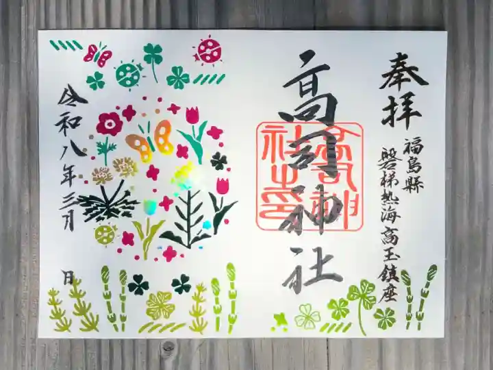 御朱印の絵柄は「神社境内にちなんだもの」をモチーフに宮司監修の下、裏方万歳が全て考案・奉製しています。小さな村の鎮守様ですが御朱印を通じて、「高司神社」の名が世に拡まる事を願っています。