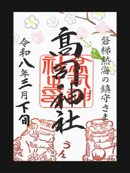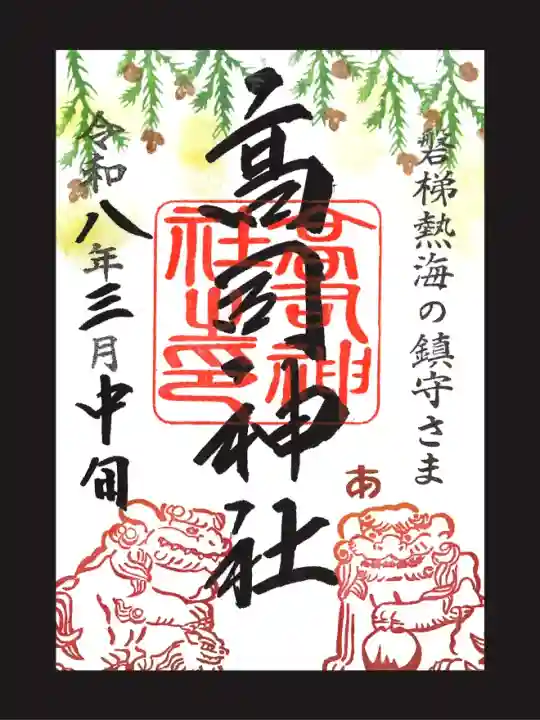 御朱印の絵柄は「神社境内にちなんだもの」をモチーフに神職が全て考案・奉製しています。参拝された時期や風景など、その月の中でも「変化する御朱印」をお分けしています。小さな村の鎮守様ですが御朱印を通じて、「高司神社」の名が世に拡まる事を願っています。