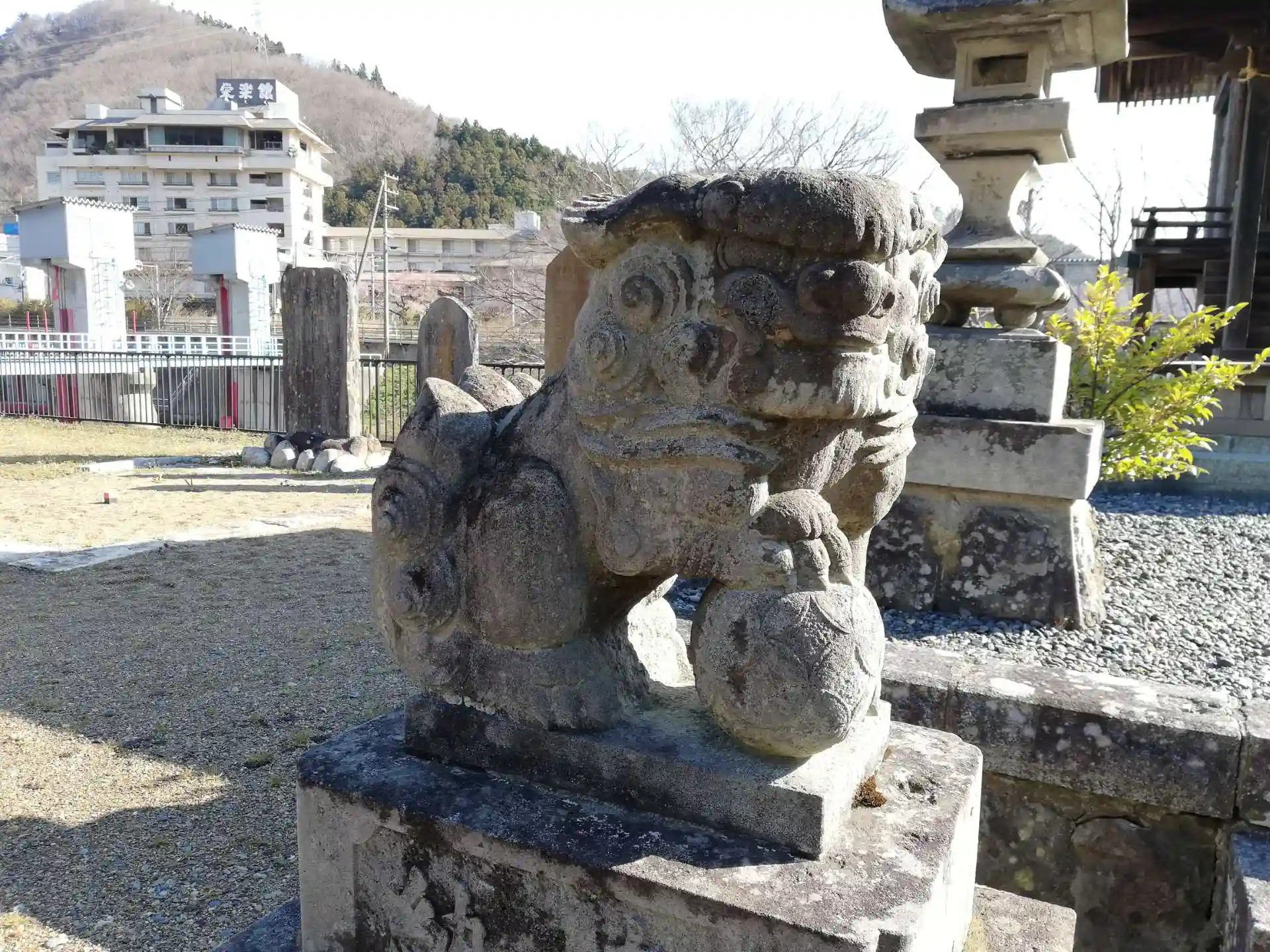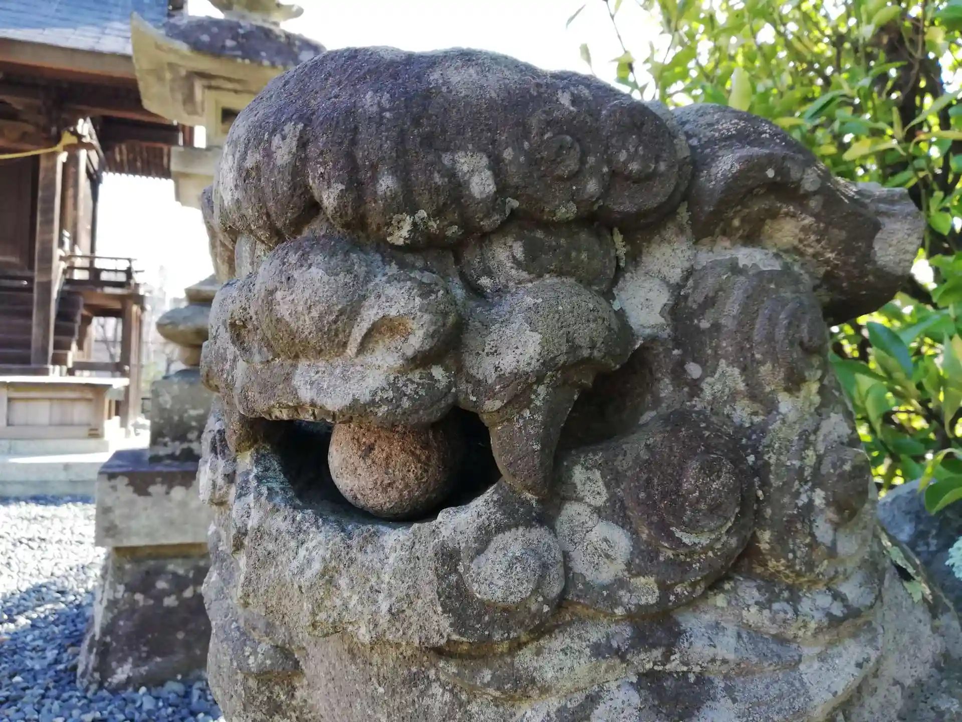神社の狛犬さん。阿の狛犬さんの口の中には珠が入っていて、転がせます。