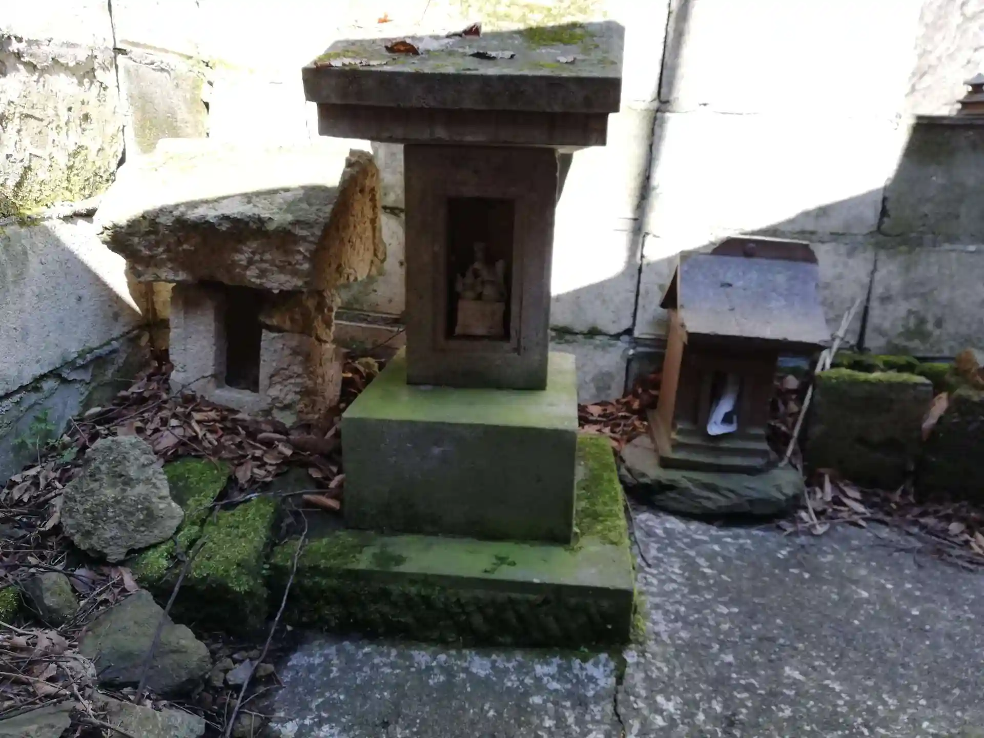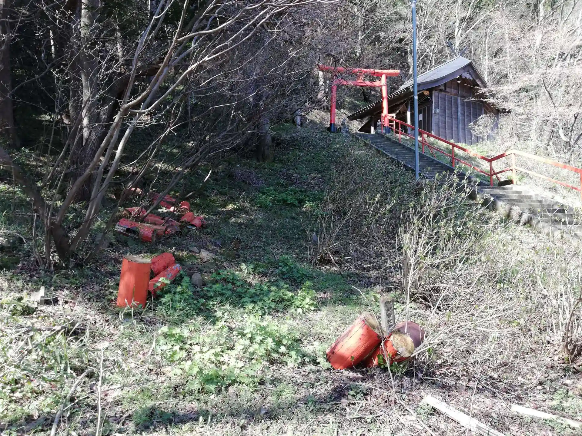 一の鳥居と二の鳥居の間の階段わきには、鳥居だった丸太が転がっていました。お休み処として立ててあったのが風雨などで倒れたのか、イノシシが倒したのか、気になります。