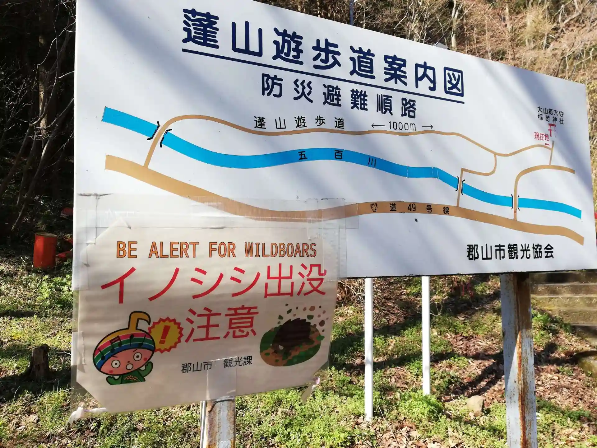 一の鳥居の左手にはけやきの森散策コース(蓬山遊歩道)があります。イノシシ注意。