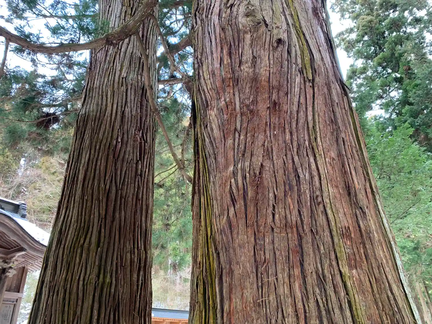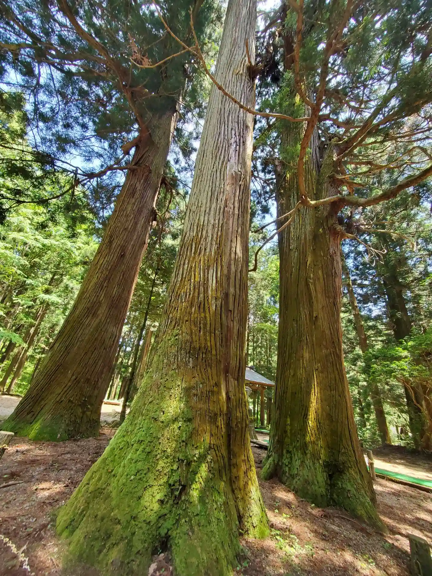 拝殿の前にほぼ同じ大きさの大杉が三本…