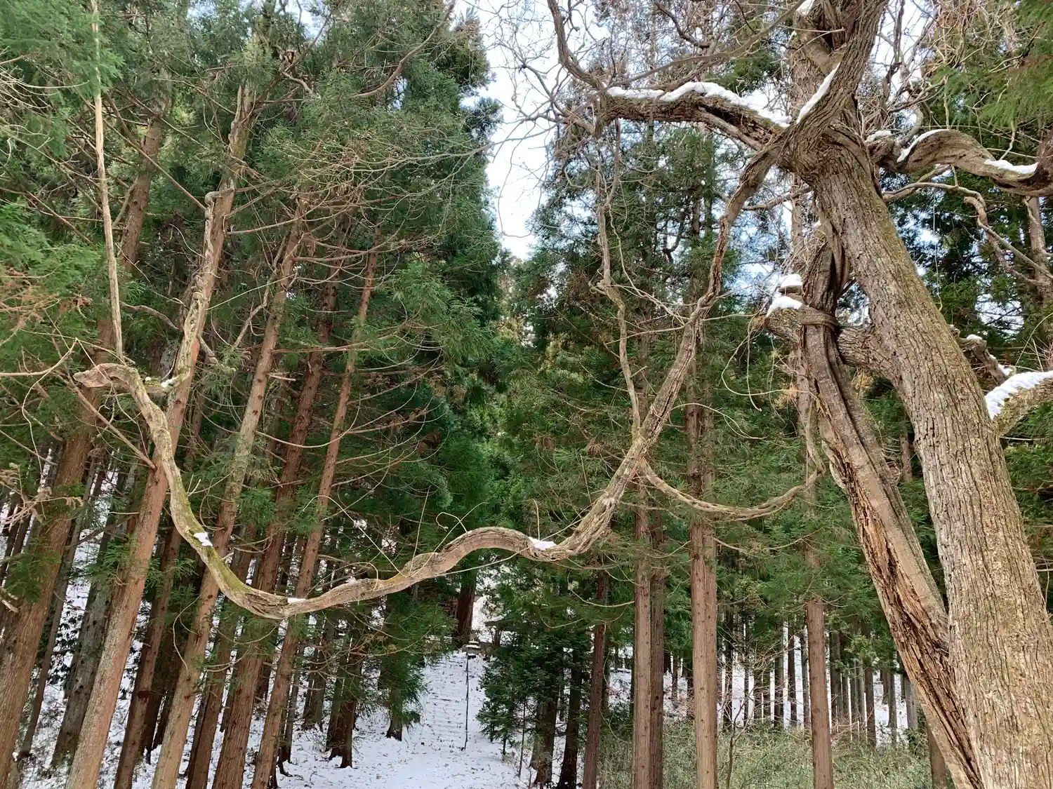 目前に紐のように垂れたきの枝があり、第二の鳥居のように見えます。