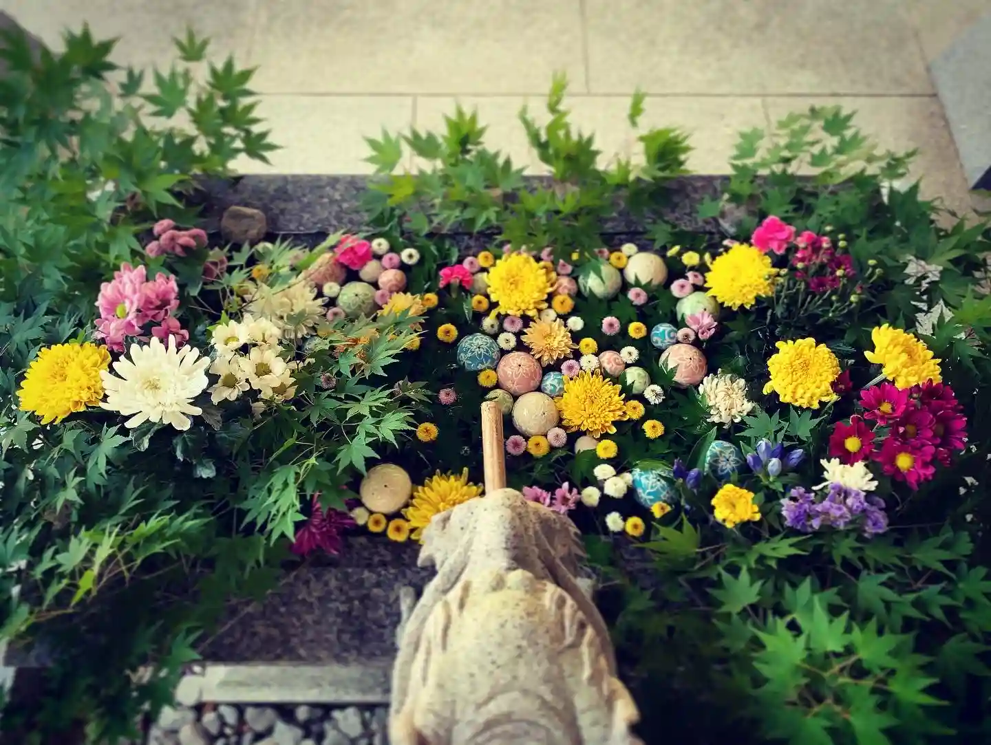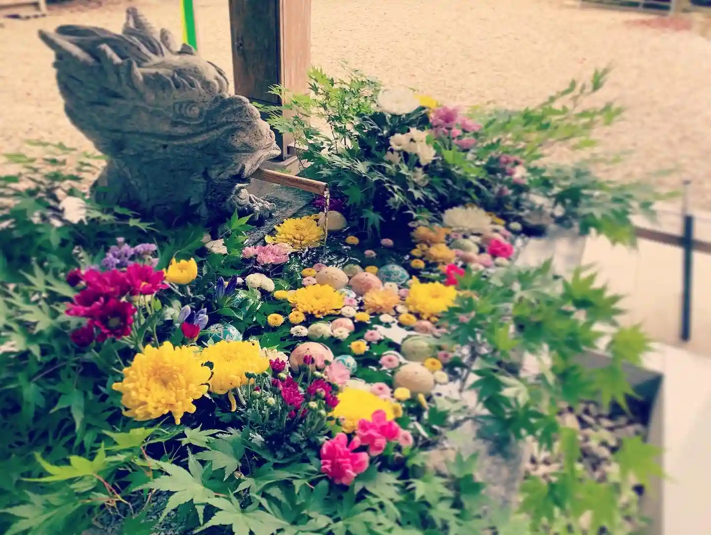 3日に一度くらいの間隔で、傷んだお花を少しずつ新しいものに入れ替えて、管理しています。ですので、花手水の雰囲気がガラッと変わることはありませんが、少しずつ表情が変わっていく花手水をお楽しみください。