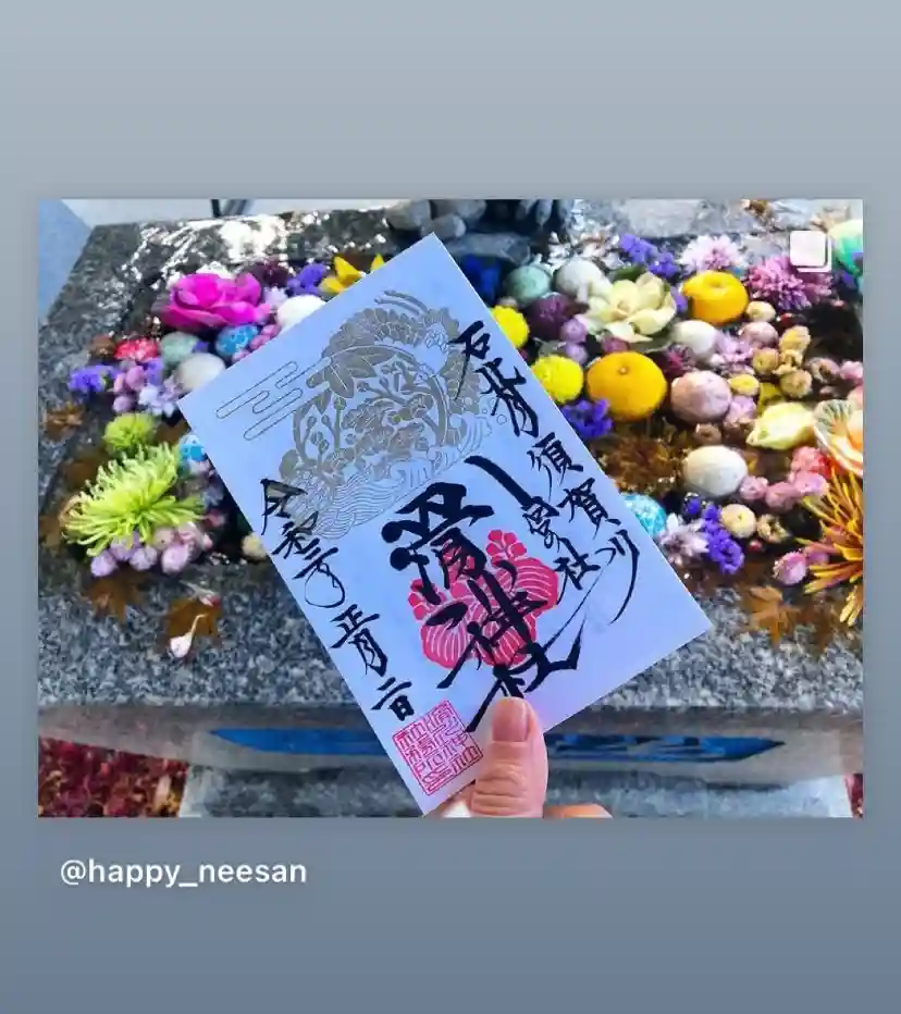 今回は、Instagramアカウント@happy_neesan さんの「御朱印」の写真をリポストさせていただきます。1月の鶴亀松竹梅の御朱印を花手水の前で撮っていただきました。