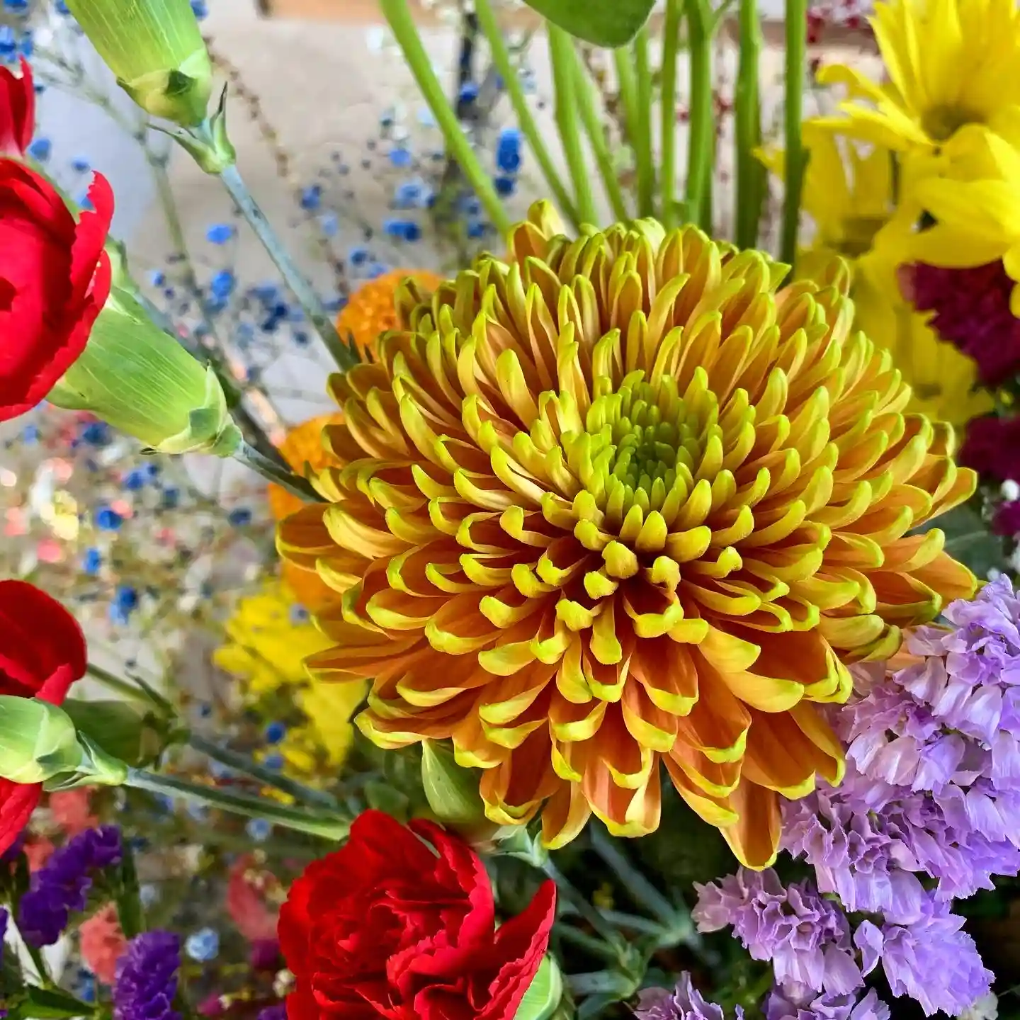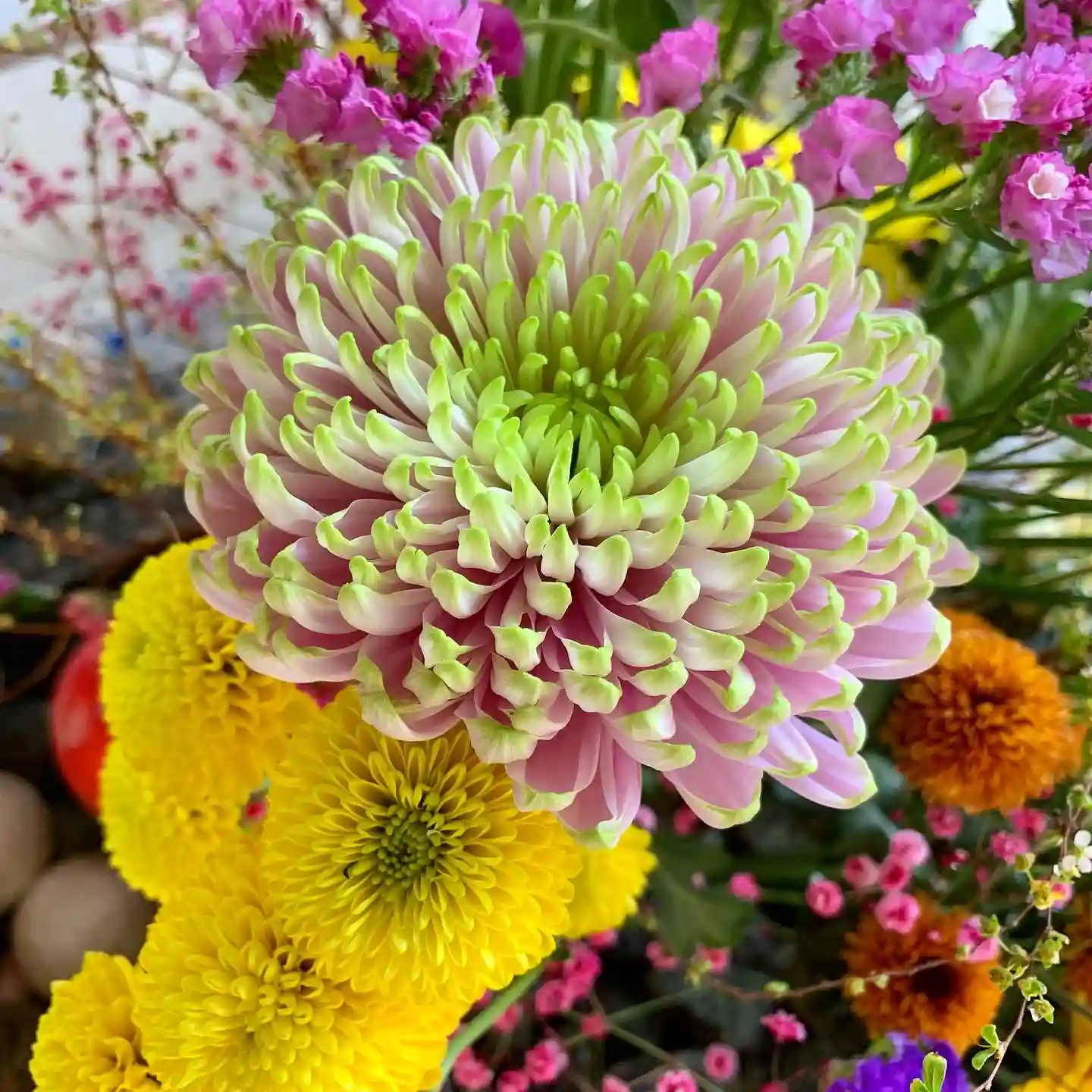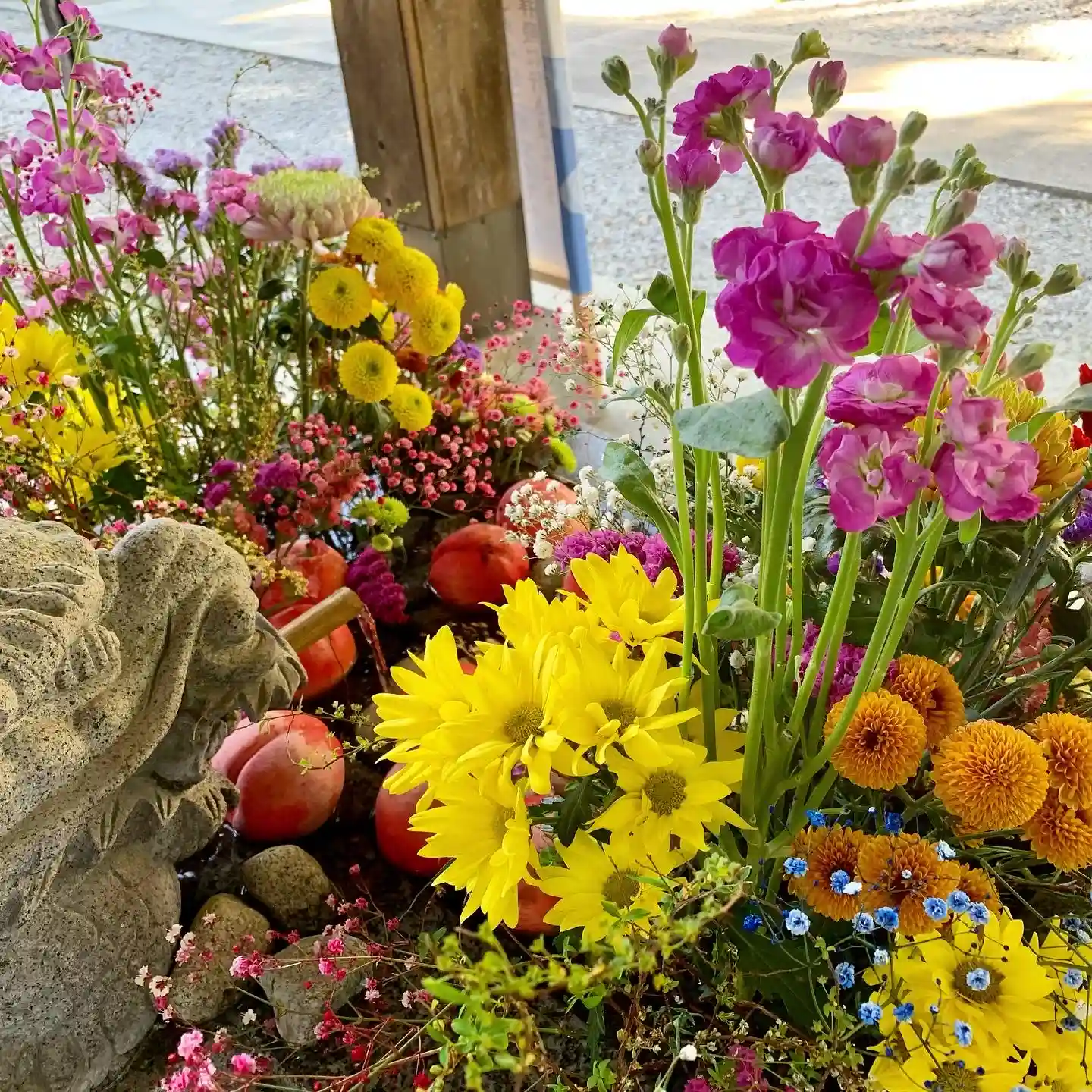 昨日整えた花手水、今日も綺麗に咲いています。