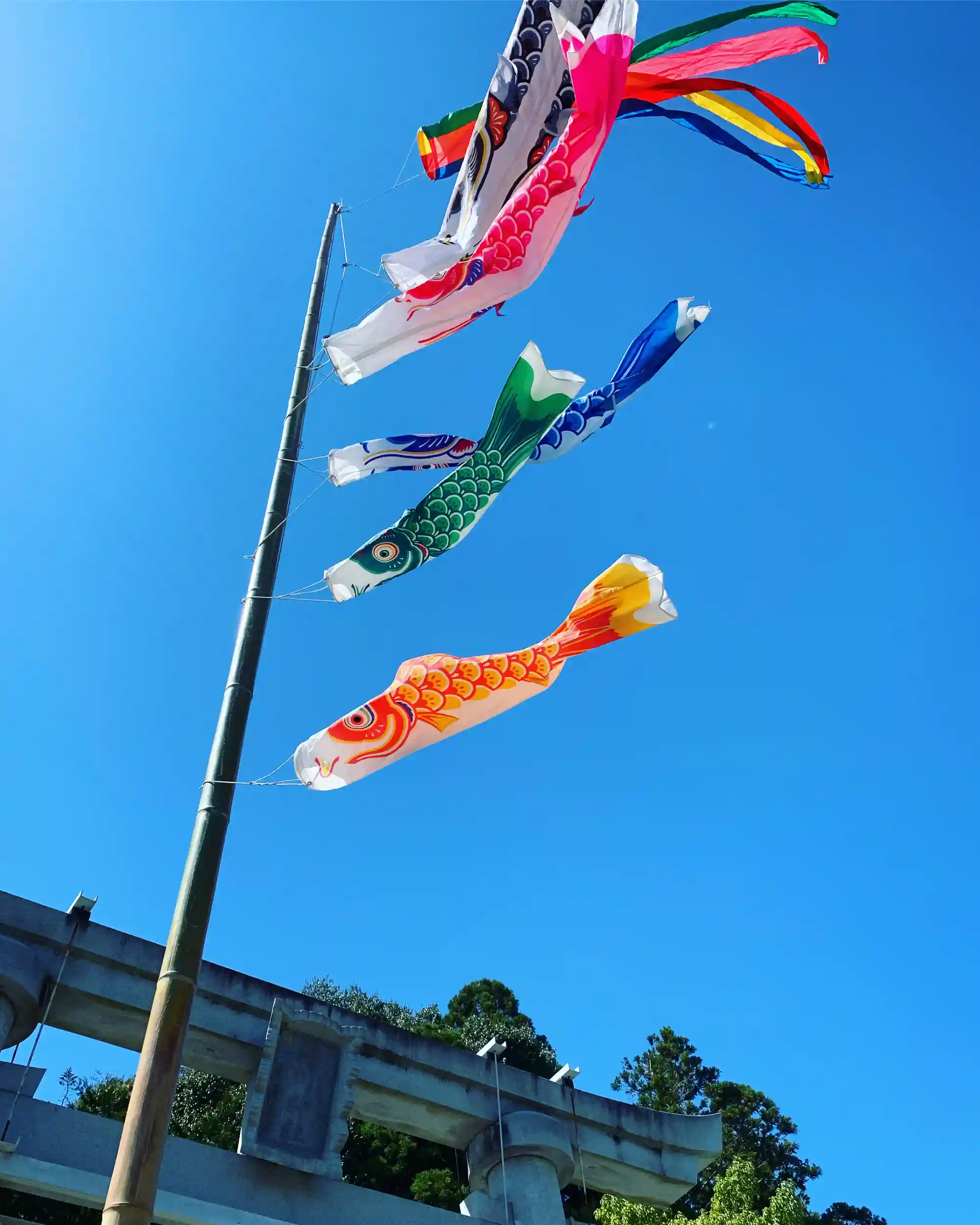 毎年、子どもたちの健全成長を祈願して大鳥居の前に「鯉のぼり」を掲揚しています。今年は「鯉の幟旗」も立って、賑やかになりました。
