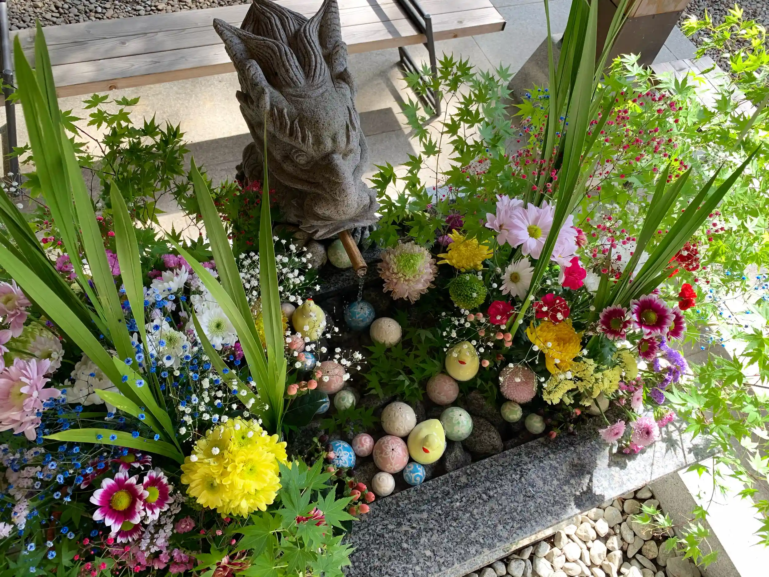 今回は「ショウブ」と「カエデ」が主体の花手水です!