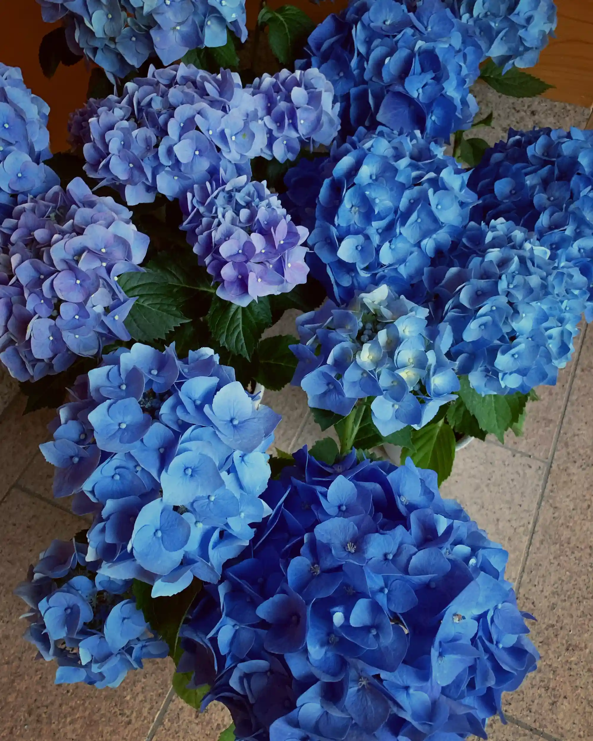 参道の石階段沿いを中心に「アジサイ」の鉢植えを置いて、皆さんに楽しんでいただいています。写真は出番待ちの「アジサイ」たちです。