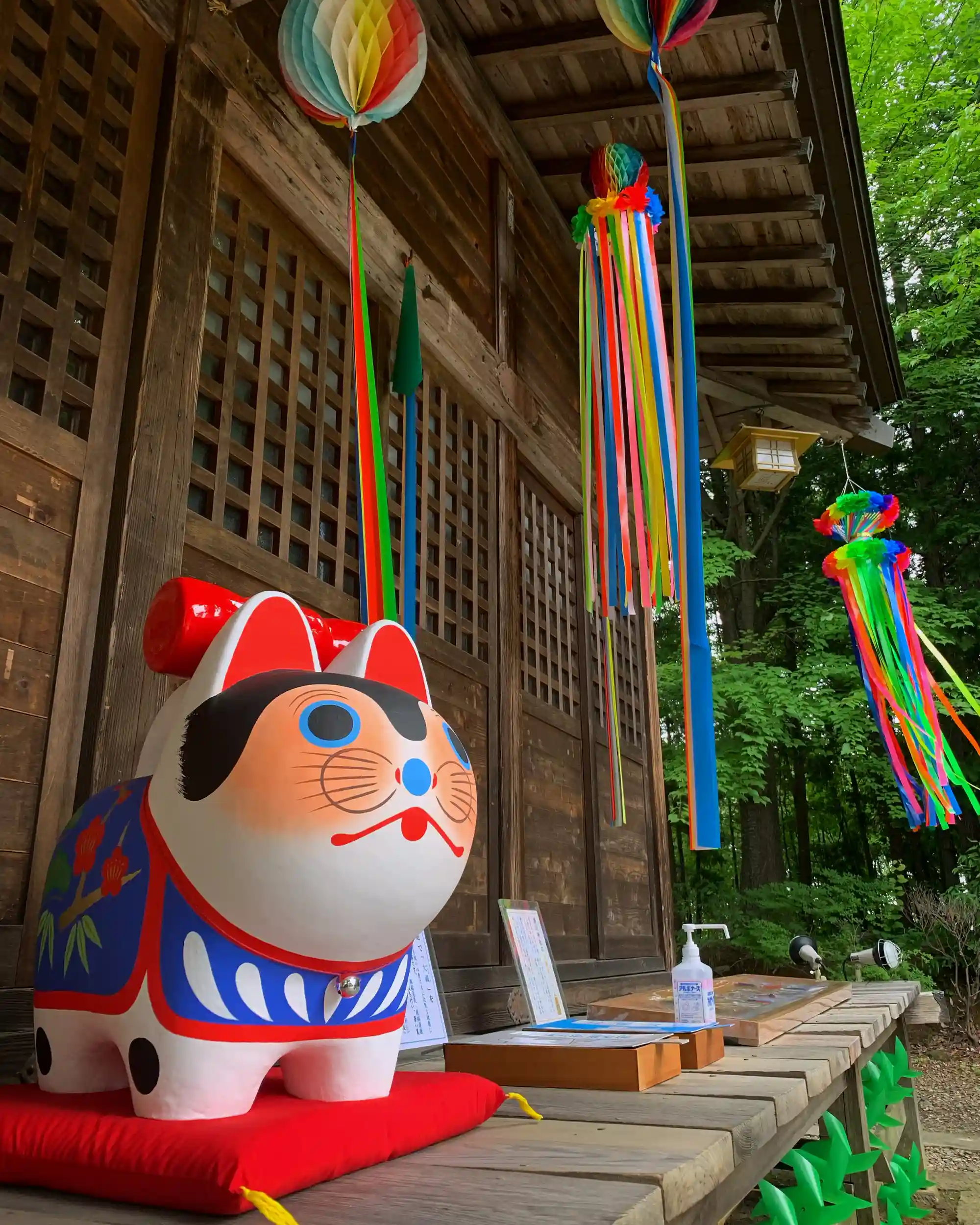 福犬の親分も皆さんのご参拝をお待ちしております。親分の定位置も吹き流しで飾りつけられて、夏らしくなってきました!