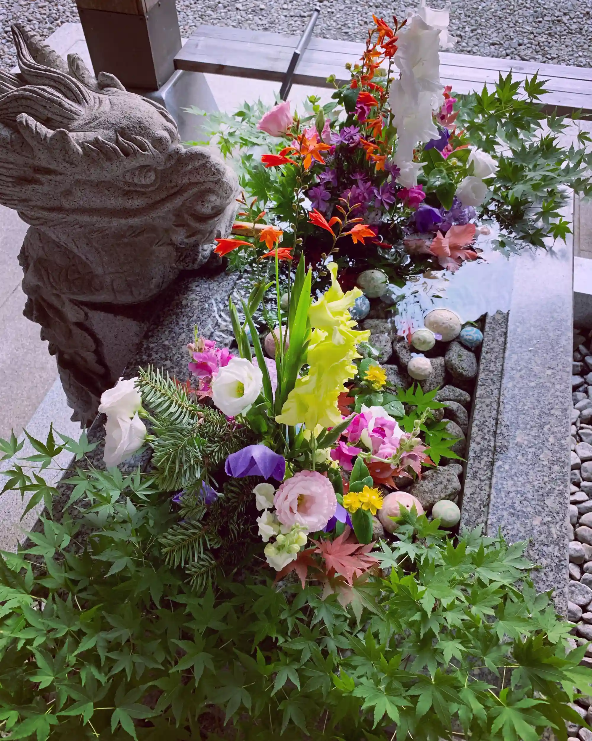 傷むのが早いので毎日の手入れが必要ですが、先日、花手水のお花を入れ替えました。楓の葉を使って、久しぶりに「盛り盛り」の花手水です!
