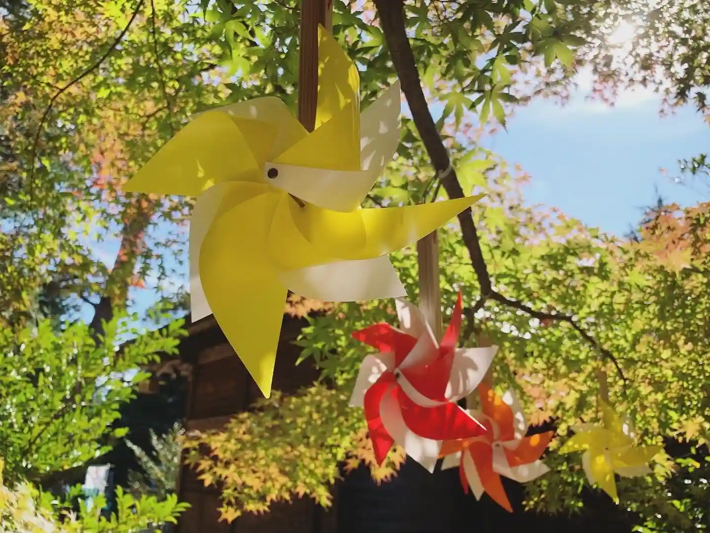 夏詣期間中「風鈴」を飾りつけていた社殿右側の「楓の木」に、手づくりの「風ぐるま」を取りつけています。
