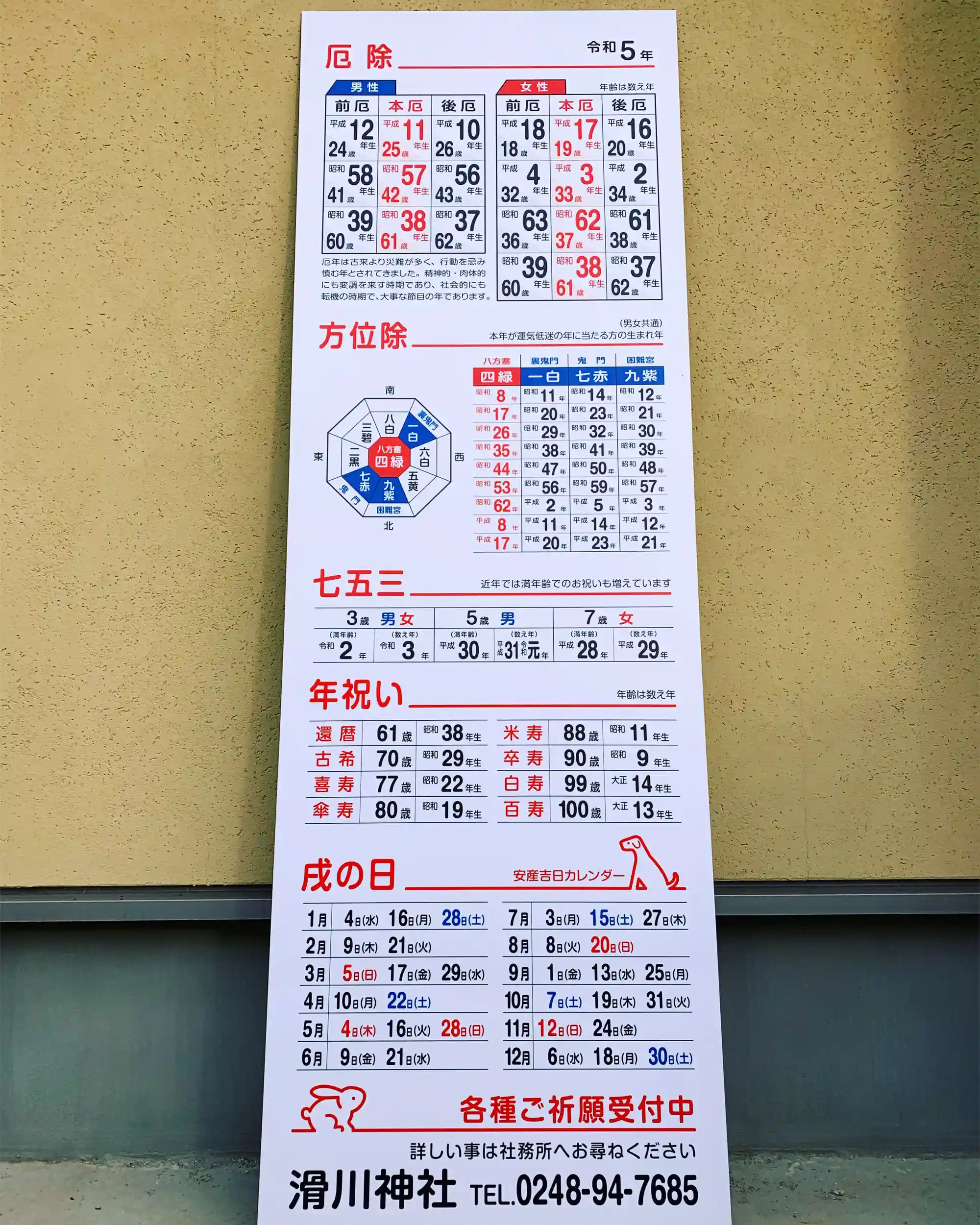 厄除け・方位除けの他に、「安産祈願の戌の日」カレンダーや、「年祝い」のご案内もありますので、参考にしてください。