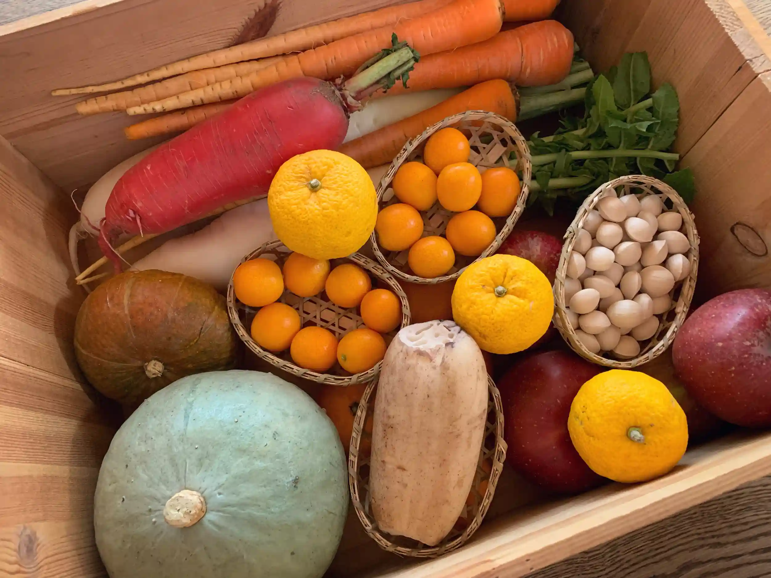 本日(12月22日)は「冬至」。柚子や南瓜(かぼちゃ)など、冬至のお供えを準備。「運」を呼びこむ「冬至七種」を中心に「ん」のつく季節の野菜を揃えました。