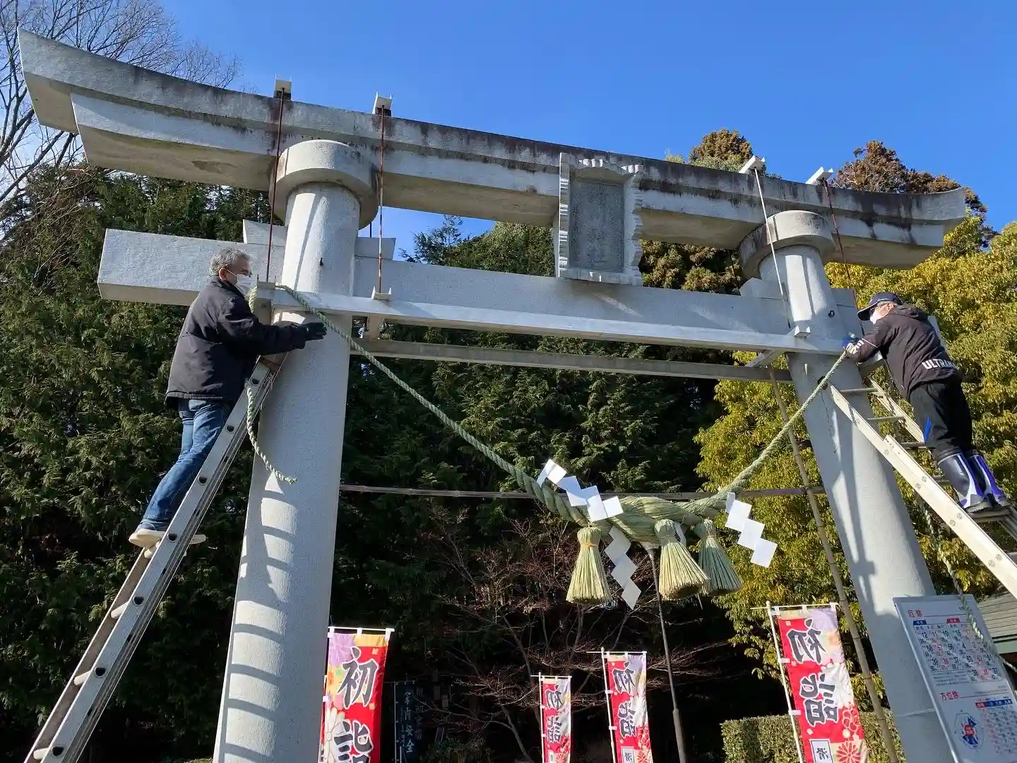 今日は、氏子総代の皆さんのご奉仕により、境内の清掃および注連縄の掛け替えが行われました!新しい注連縄は、やっぱり良いですね!