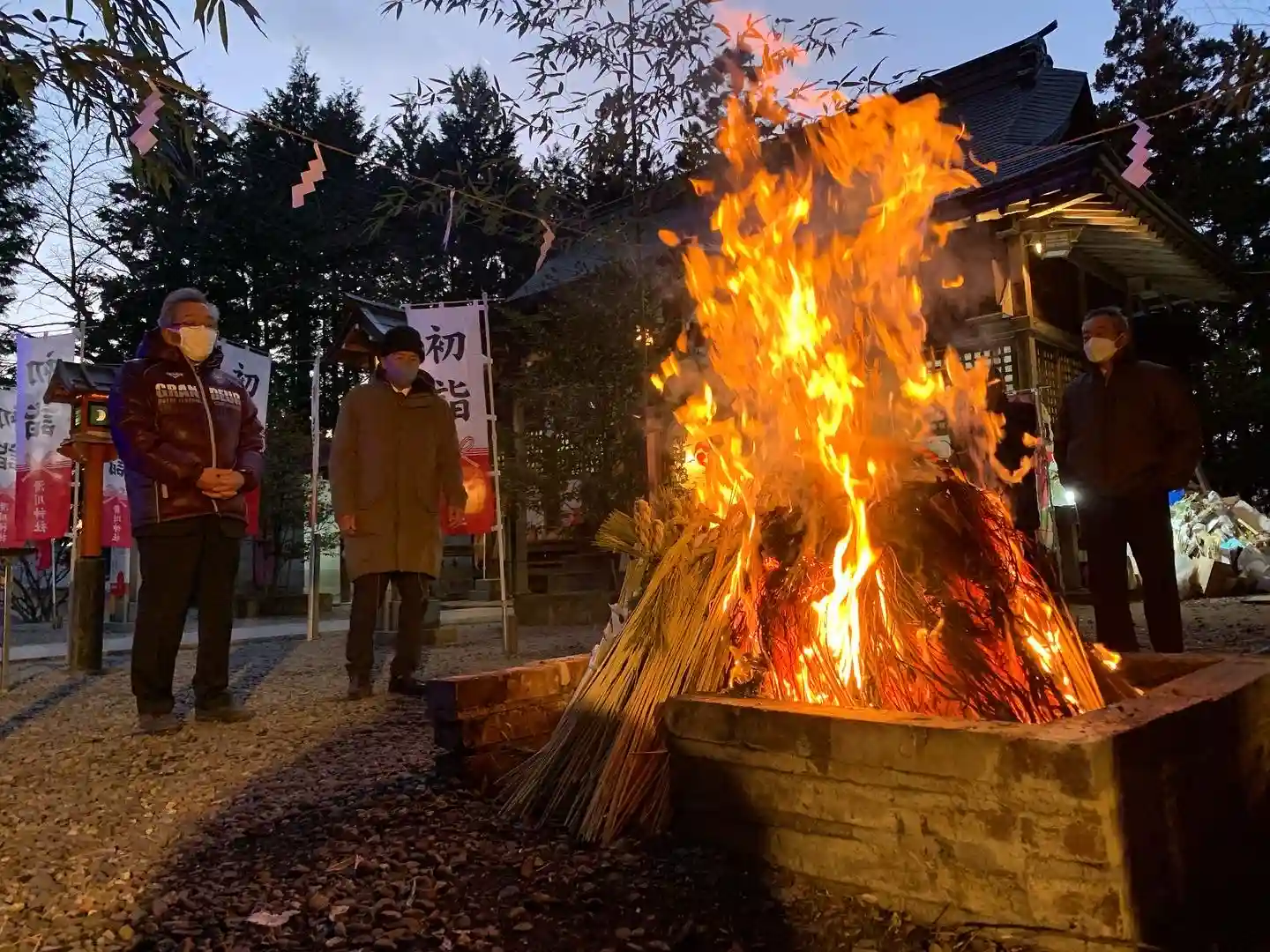 午後5時より、お正月飾りや古い神札などをお焚き上げする「どんど焼き」を行いました。小正月の1月15日に行うところが多いかと思いますが、県内では、松の内の最終日(7日)、もしくは翌日に行う地域も多いです。
