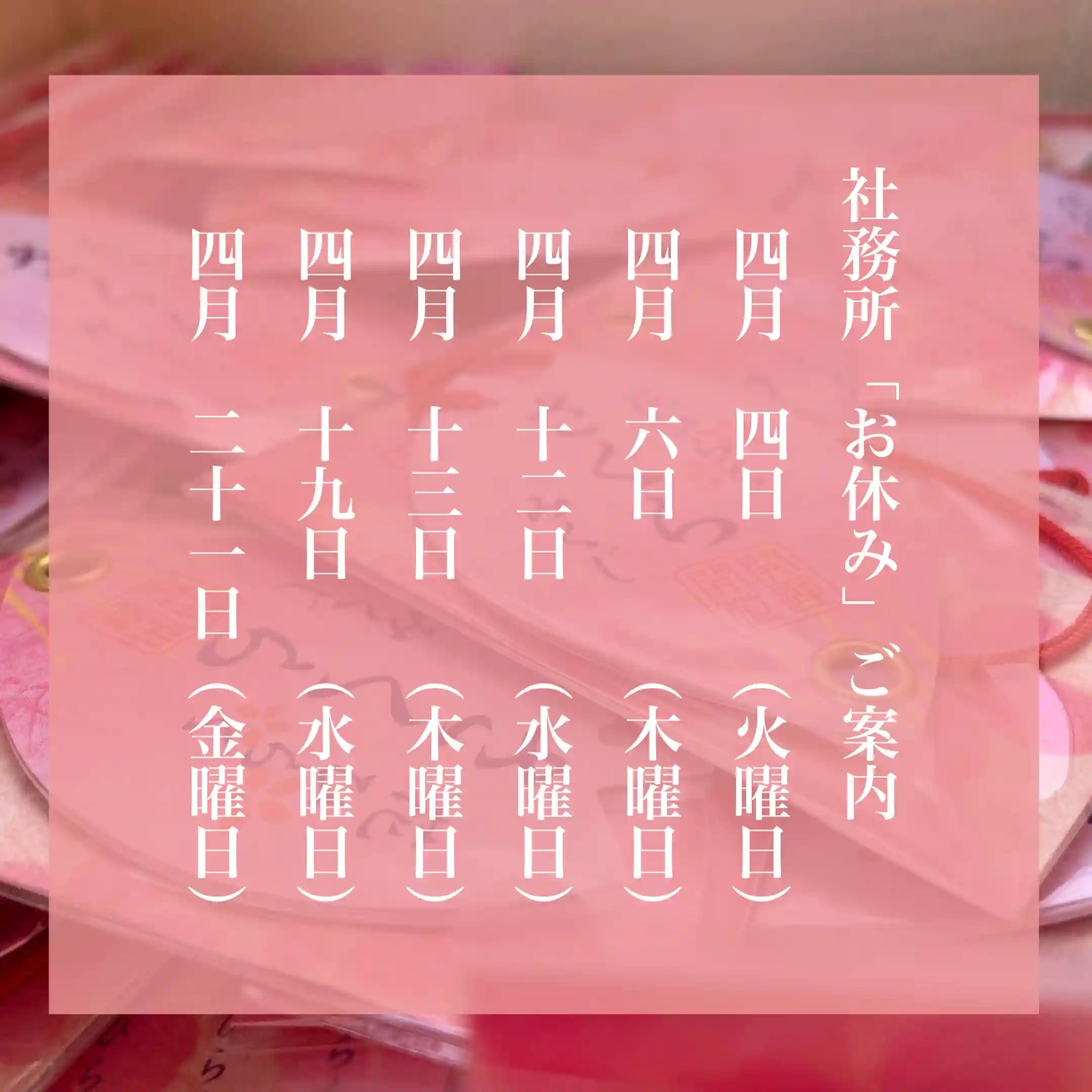 おはようございます。今日もお天気もよく市内の桜も見頃をむかえています。基本的に水曜日と木曜日に社務所「お休み」をいただいていますが、今月は下記の通りとさせていただきます。