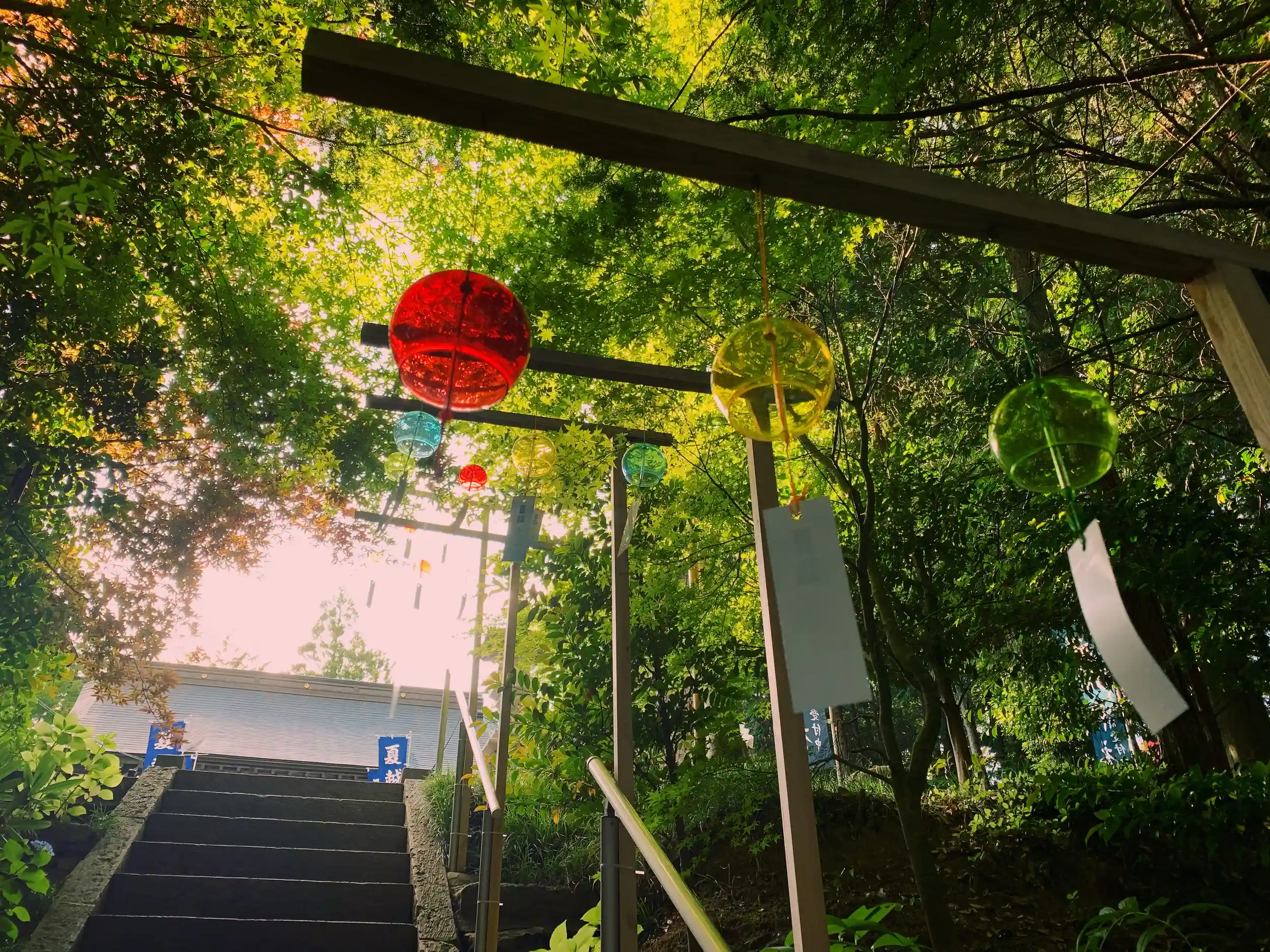 暑さが落ち着いた夕暮れの境内も趣きがあって良いものです。ひらひらとゆれる吹流しと風鈴の音に心が落ち着きます。