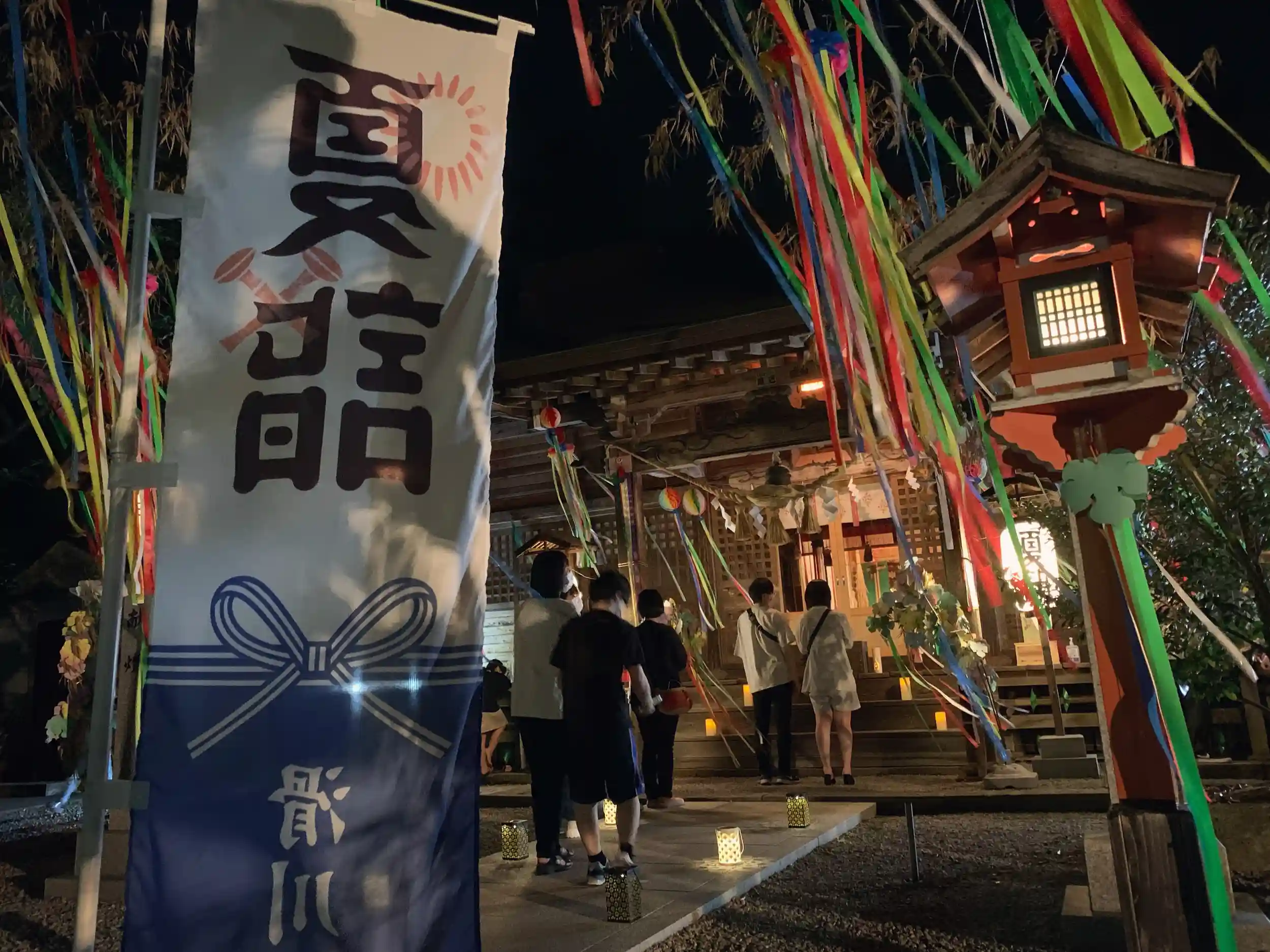 賑やかに飾りつけられた七夕の境内。ライトアップも予定しております。皆さんのご参拝お待ちしております!