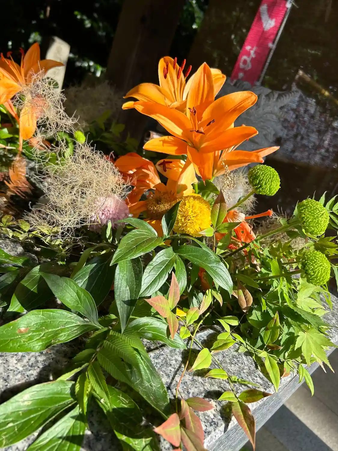 手水舎は、オレンジ色のユリや青紅葉で彩られており綺麗でした。