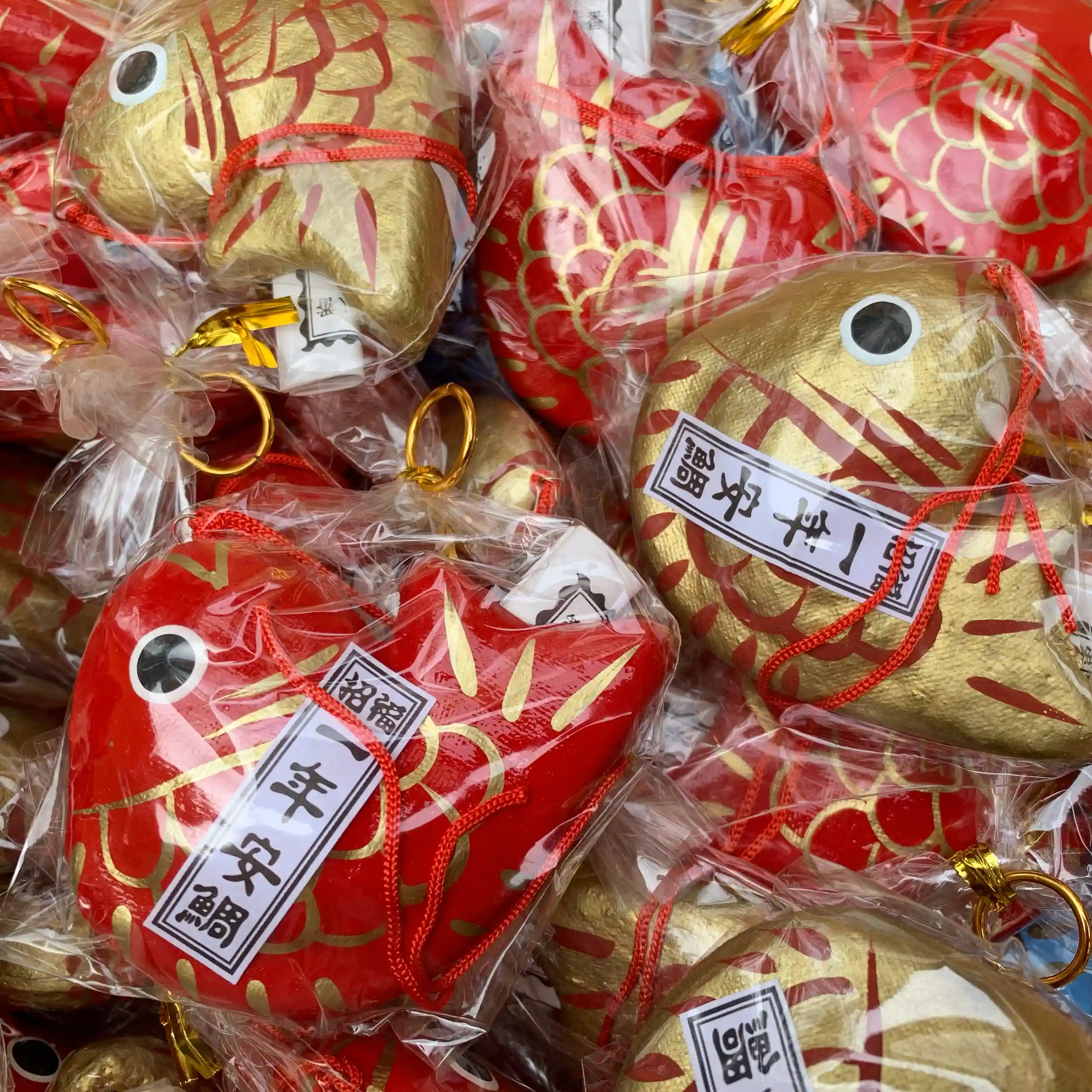 秋らしい「赤」と「金」の鯛みくじ
