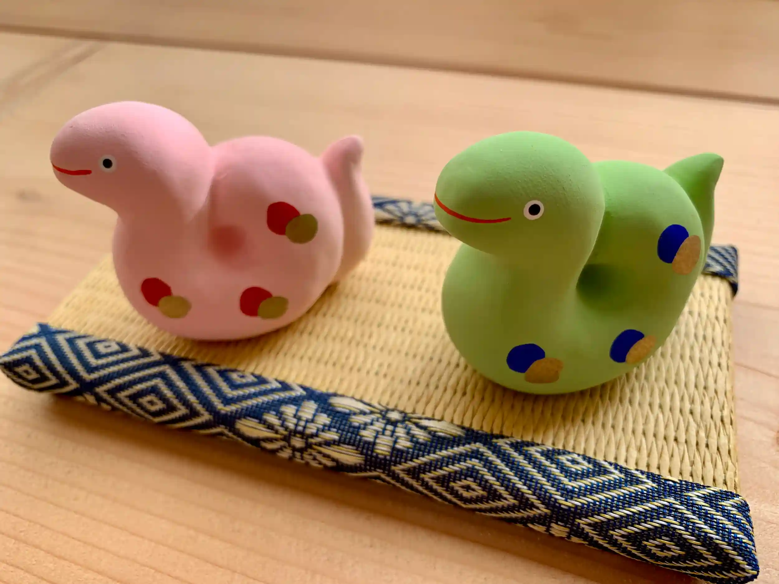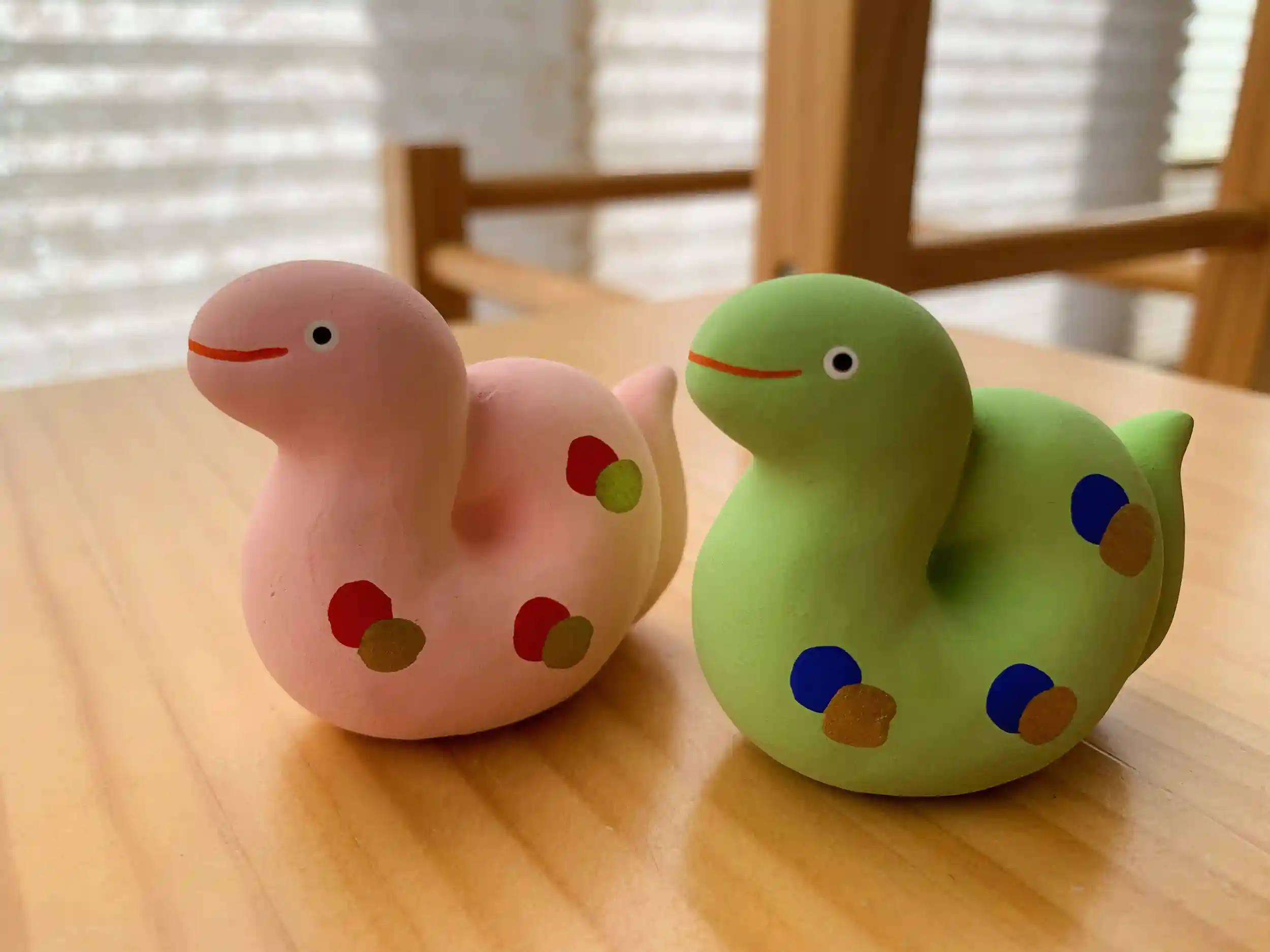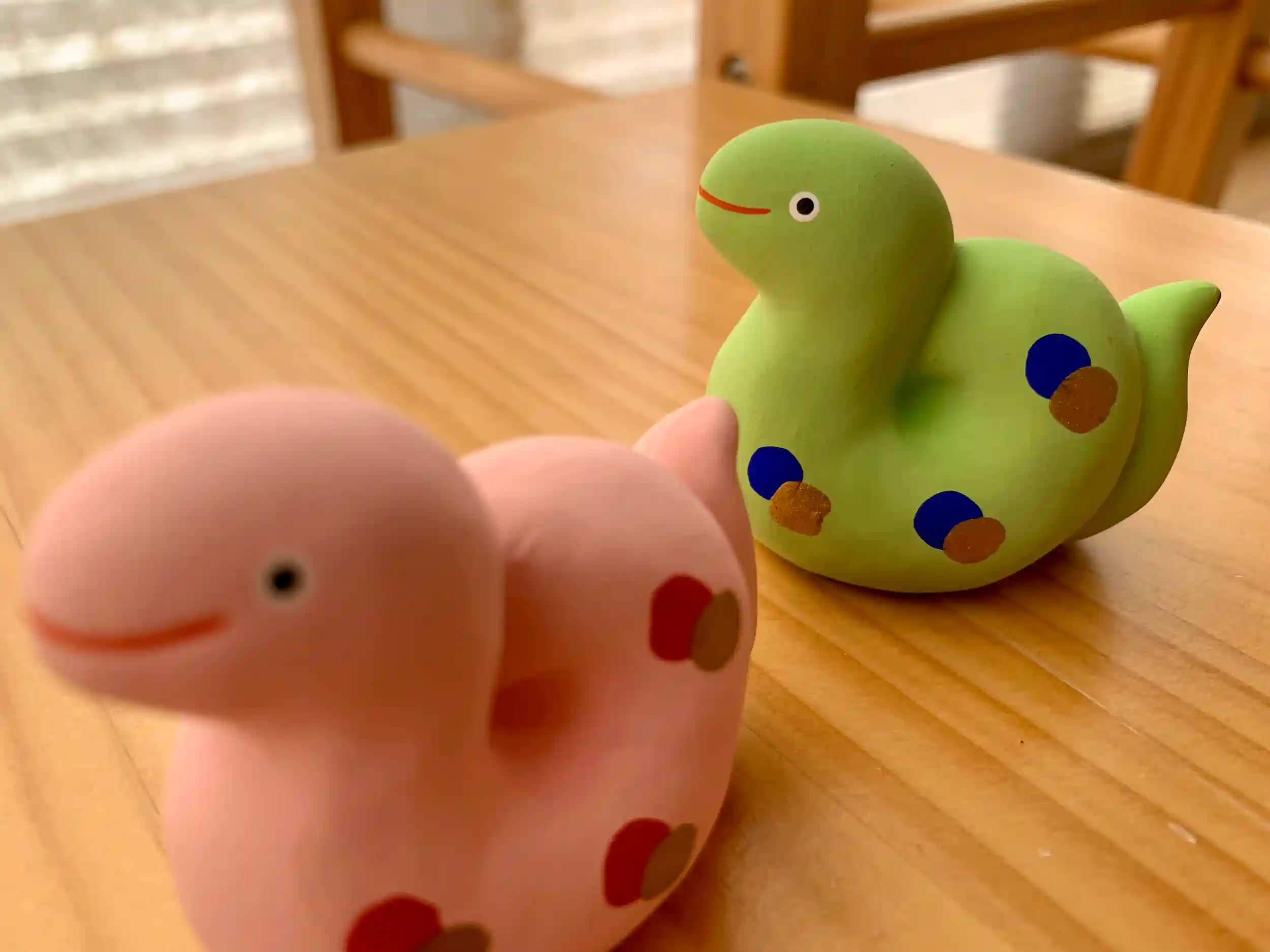 玩具工房の職人の方々による手づくりです。可愛らしい表情のヘビちゃん達、どうぞお迎えください!