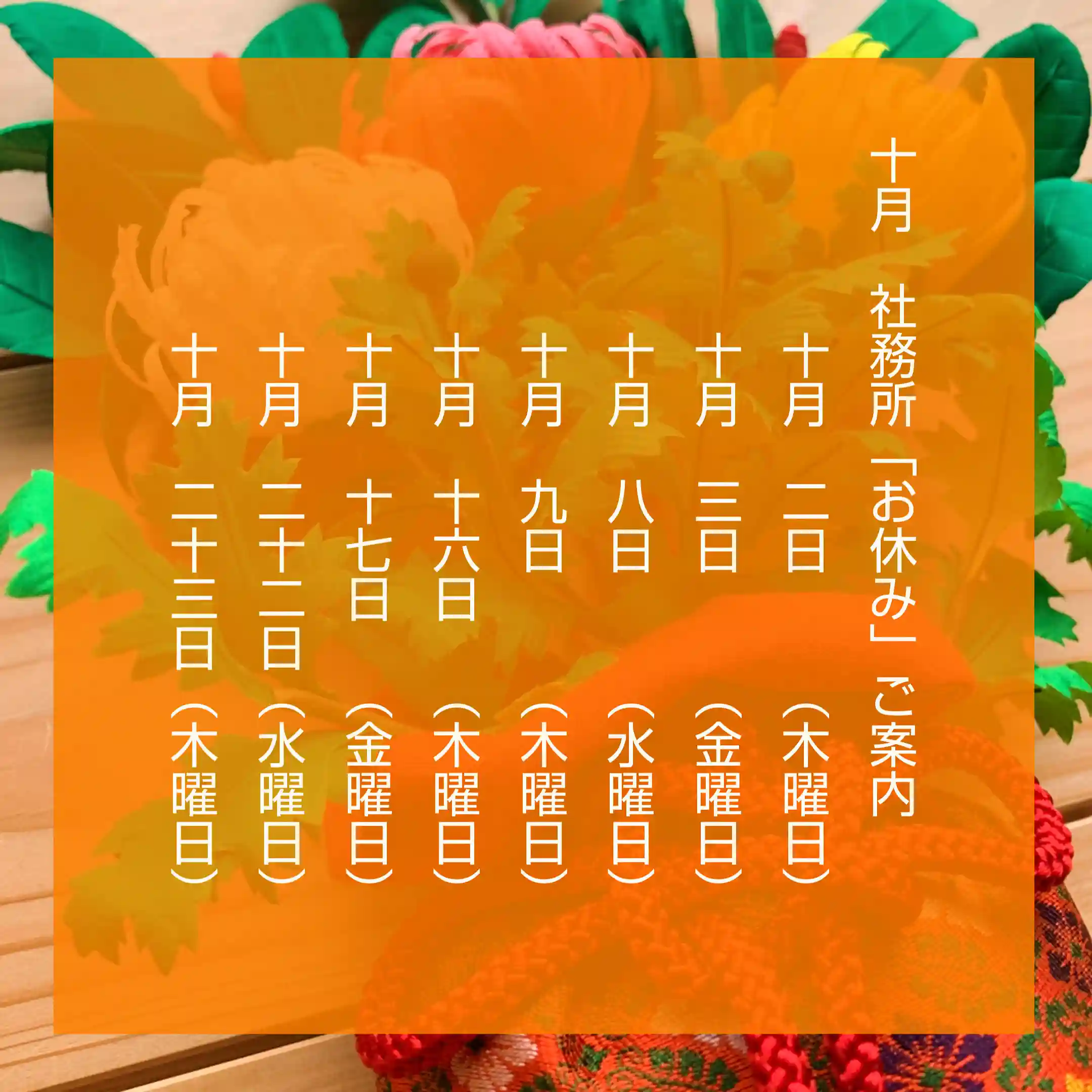 10月は秋祭り等の関係で、社務所「お休み」の日が少し不定期になります(御朱印や授与品を受けられる際はご注意ください)