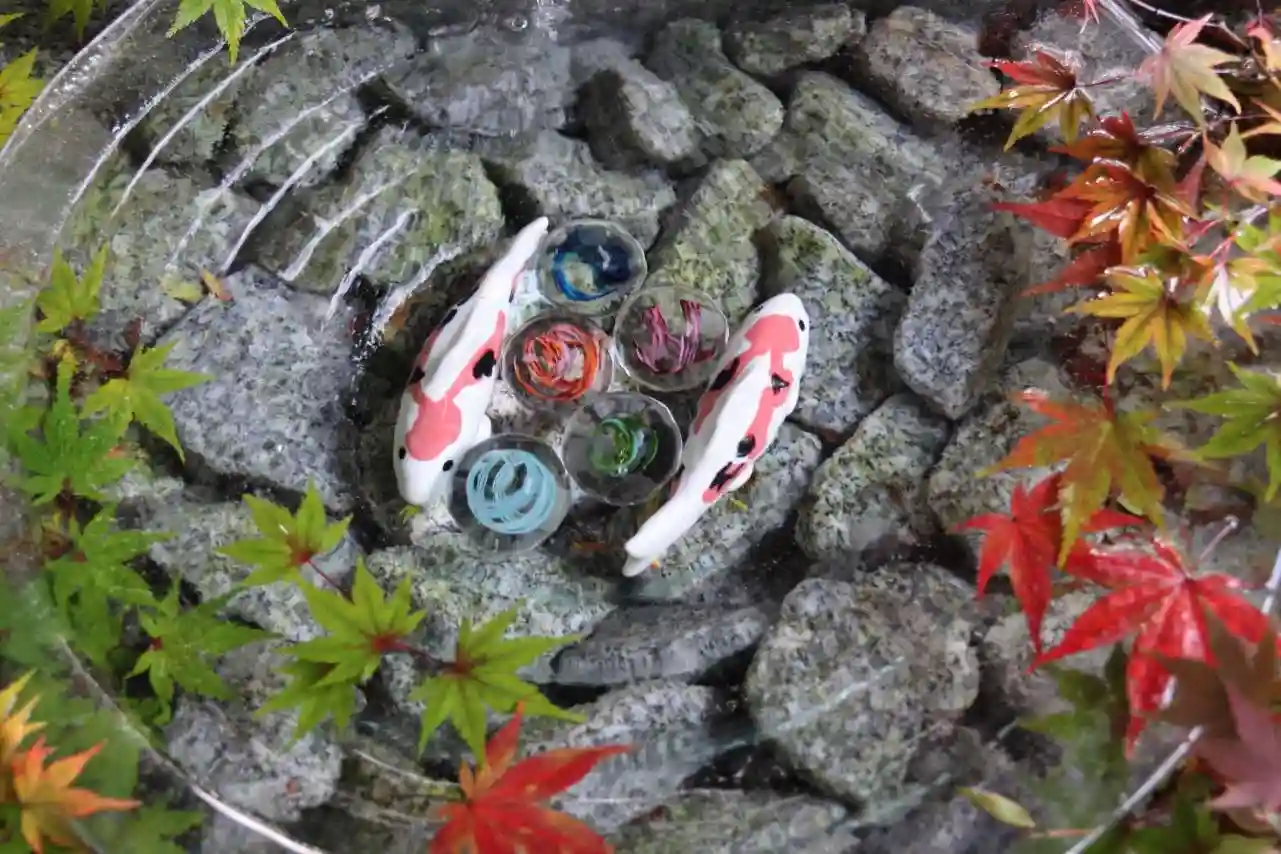 手水には楓の紅葉が飾られ