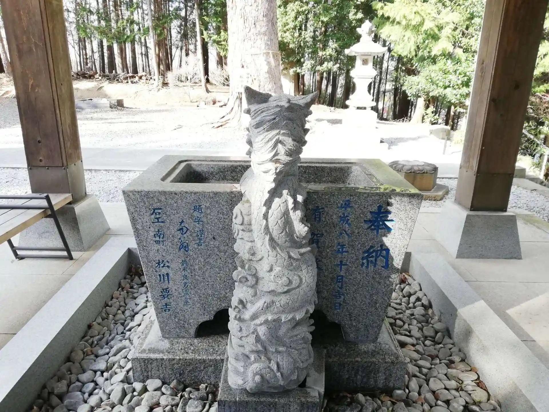 左の前足をちょこんと手水鉢に乗せてるところが、可愛いかわいい。宇倍神社の兄弟龍よりも前足が大きいと思います。