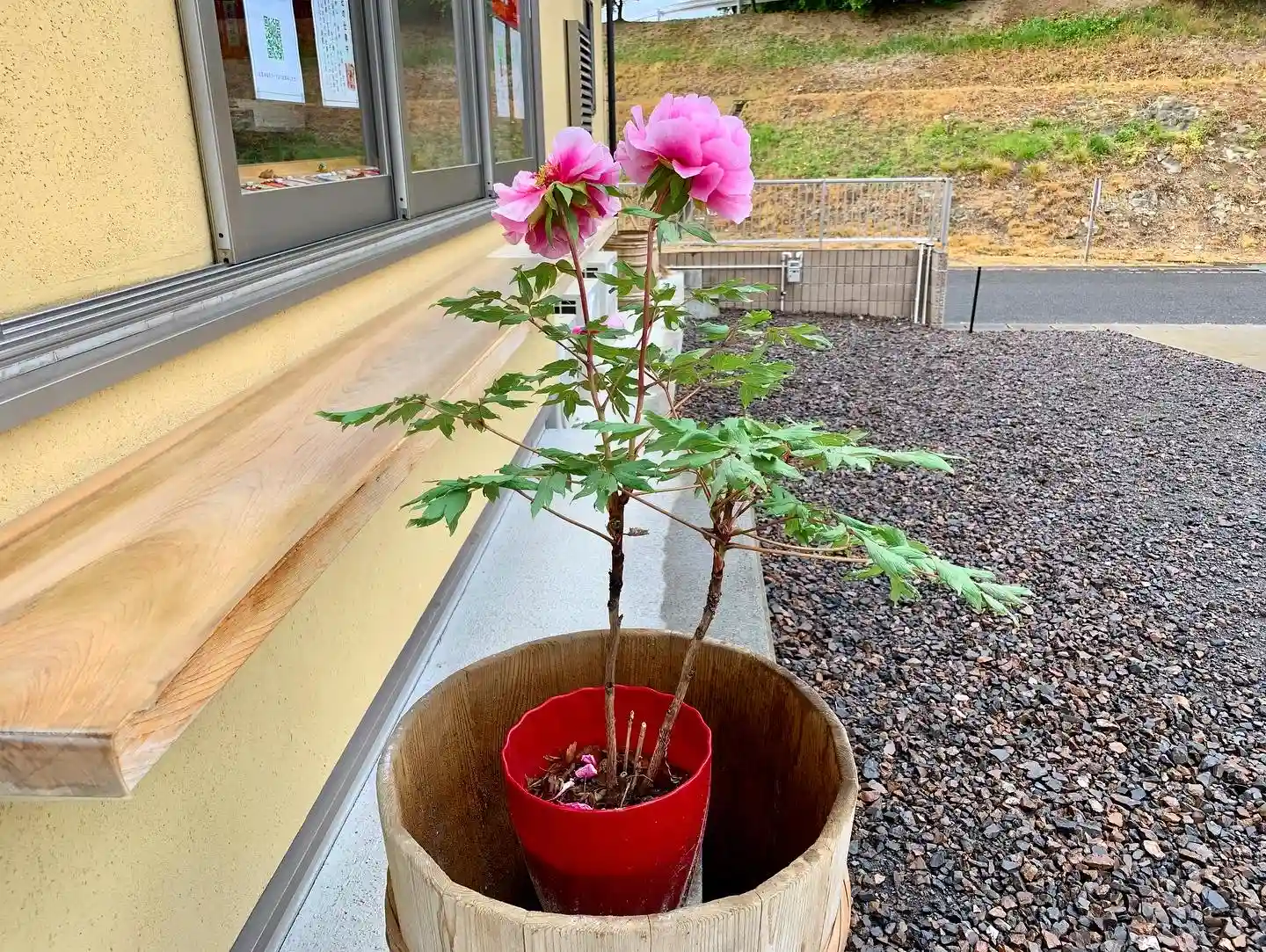 牡丹を「しょうゆ樽」に植え替えるまではいきませんでしたが、イメージとしては、こんな感じです。