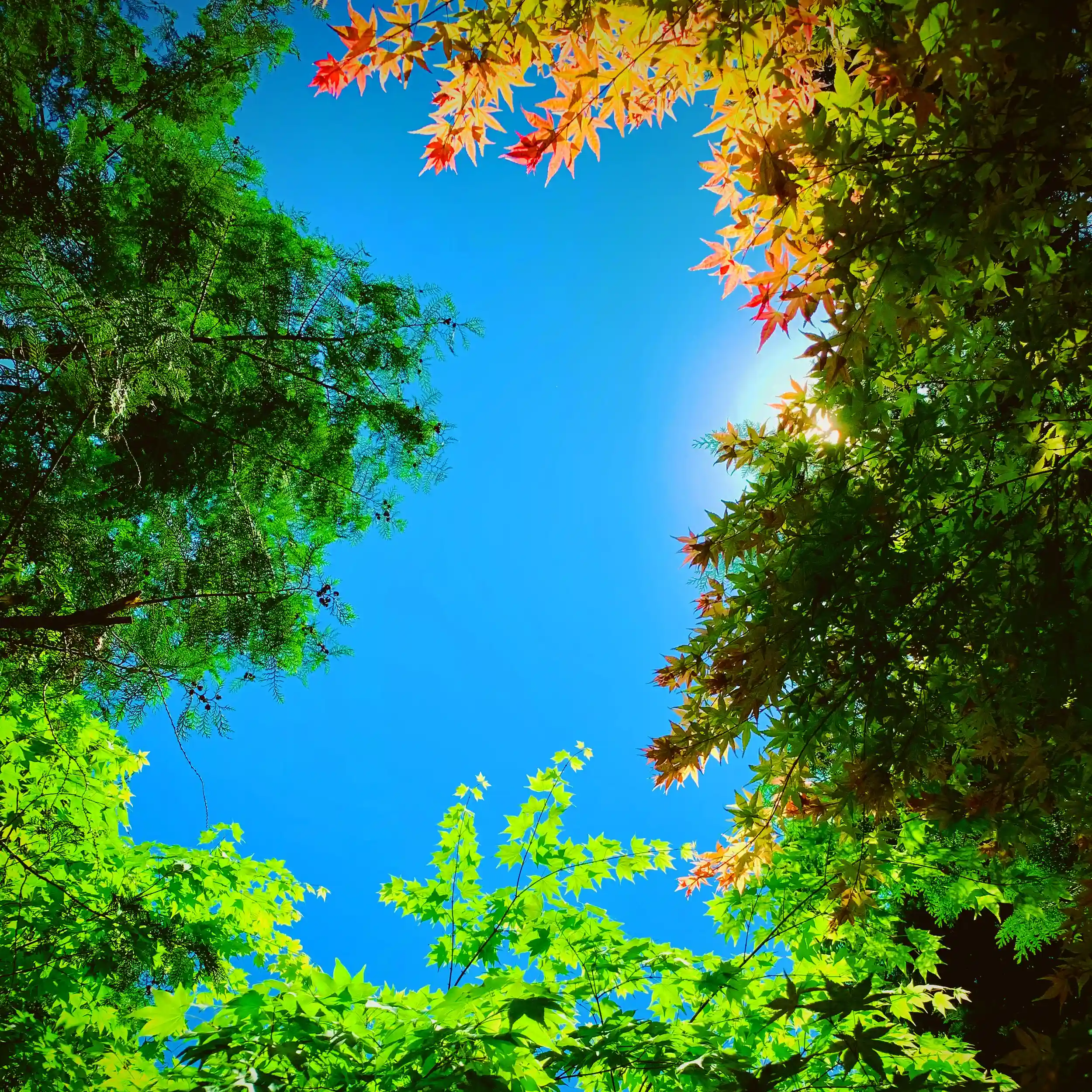 境内で新緑の写真を撮っていて、偶然切り取った1枚。雲ひとつない青空が、みずうみのようでした。