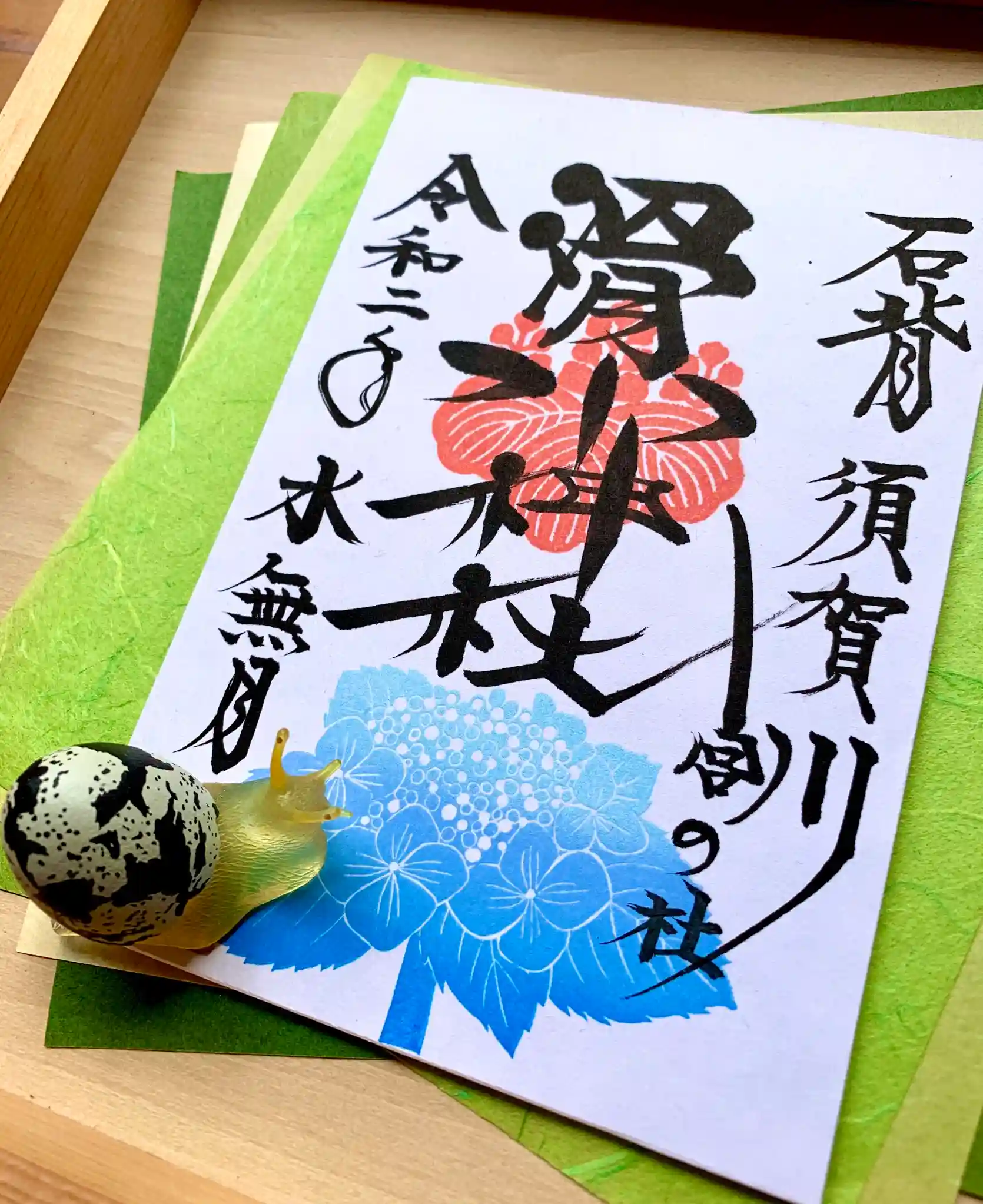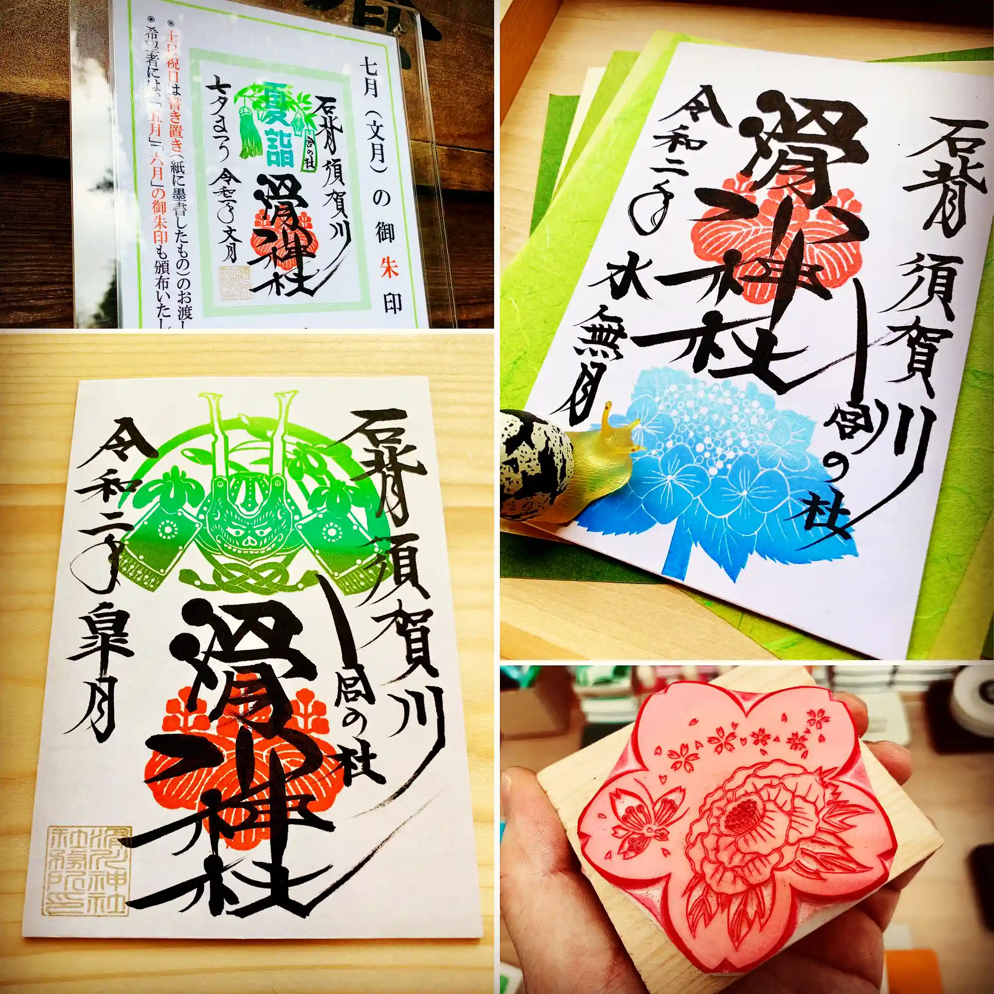 例えば、5・6・7月の御朱印を帳面に書くとすると、約15分ほどかかります。これが、3組、4組重なると、最後にお渡しする方には、1時間ほどお待ちいただくとこになってしまいますので、土日祝日の帳面への直書きは現在は厳しい状況です。平日でも、5月6月の御朱印については、書き置きをお受けいただけると有り難く存じます。