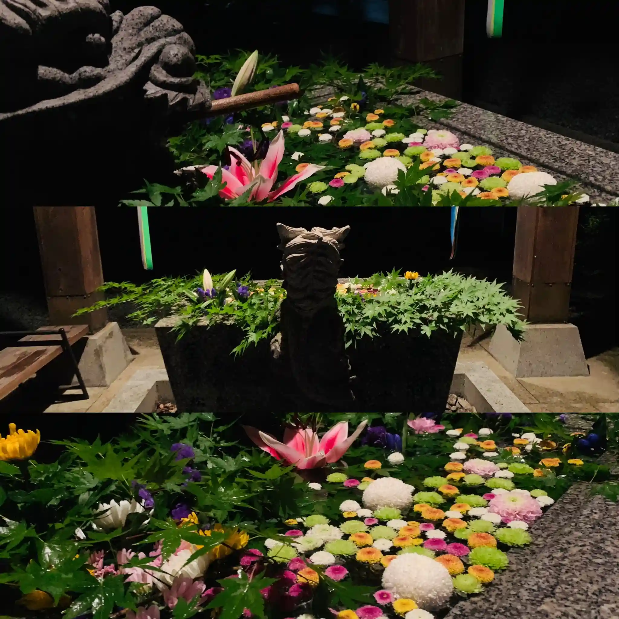 紫陽花の花手水とは違った趣があり、暫くの間、お楽しみいただけるかと思います。感染症終息の見通しが暗い中、ご参拝の皆さんの気持ちが少しでも和めば、幸いです。