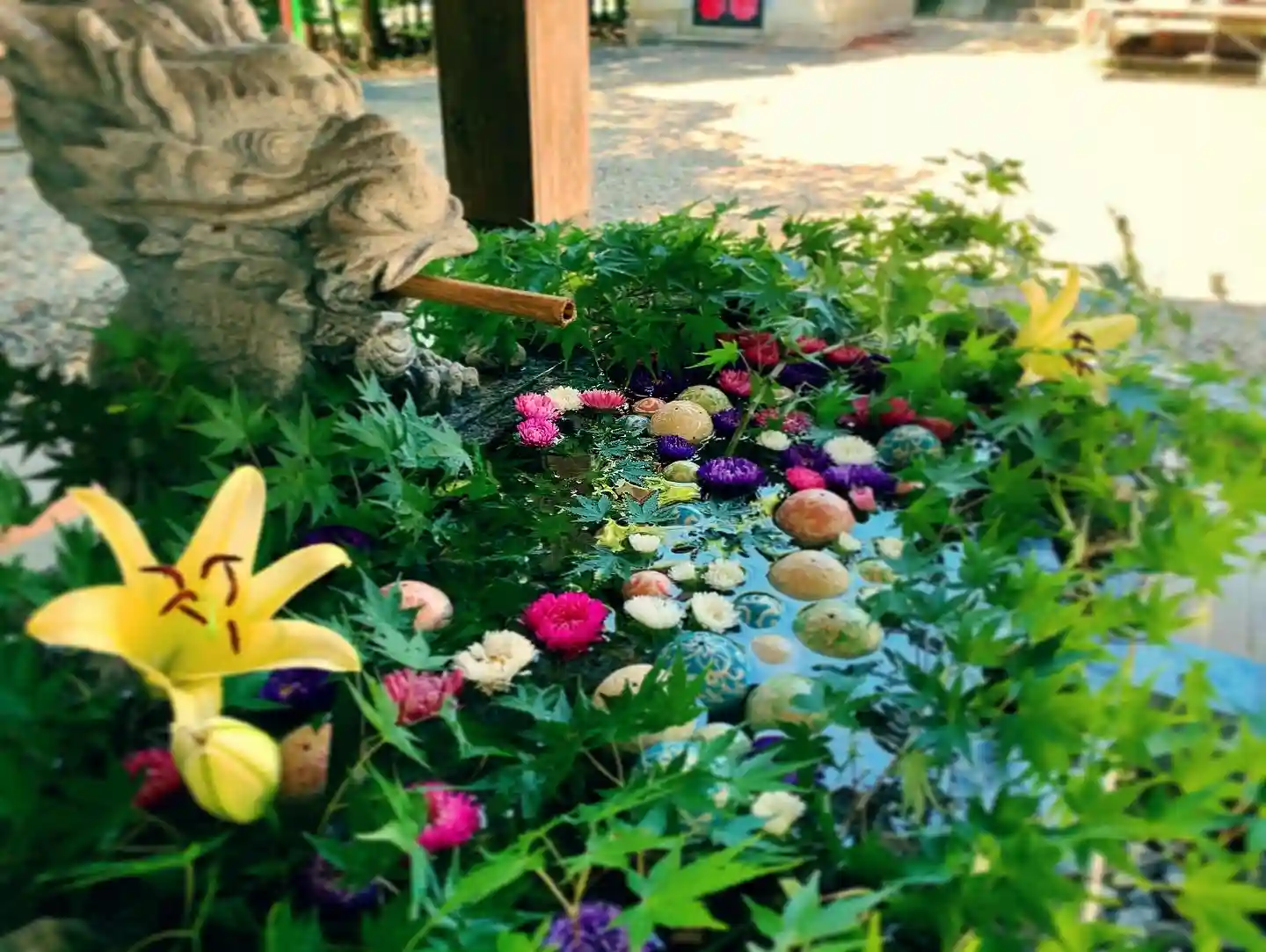 あまり代わり映えしませんが、花手水のお花を入れ替えました。イメージは「森の泉」です。涼を感じて、少しでも和んでいただければ、幸いです。
