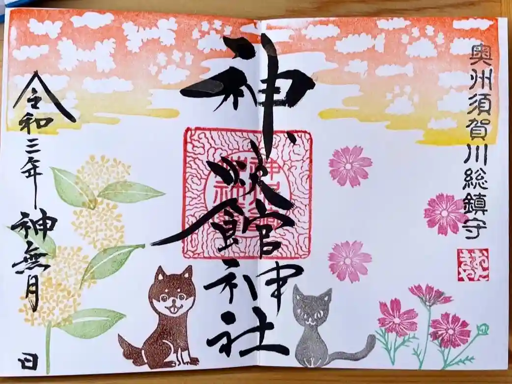 #神炊館神社 #おたきやじんじゃ #奥州須賀川総鎮守 #須賀川 #総鎮守 #御朱印 #月替わり御朱印 #金木犀 #秋桜 #柴犬 #黒猫