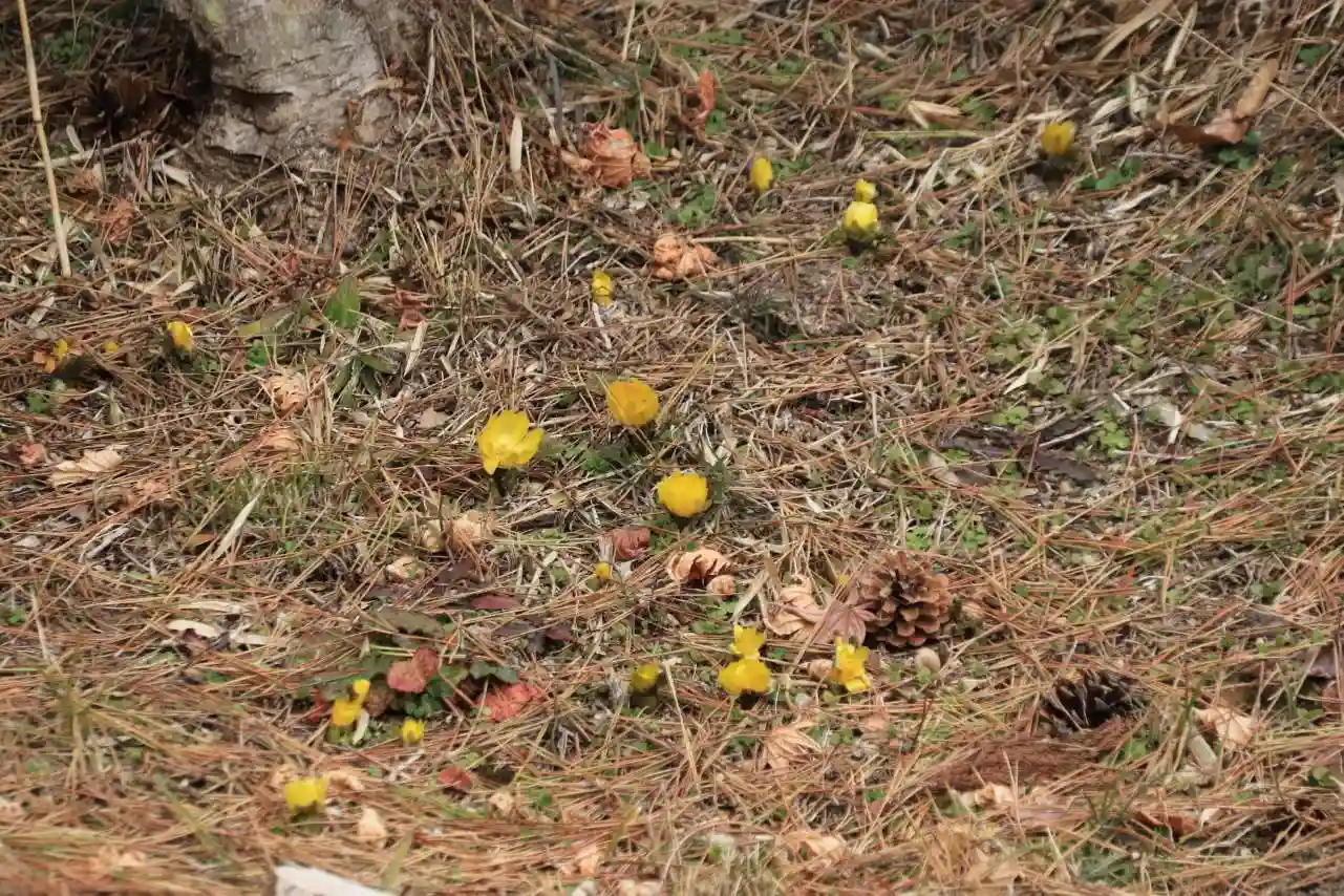 社務所の庭に福寿草が沢山咲いていました