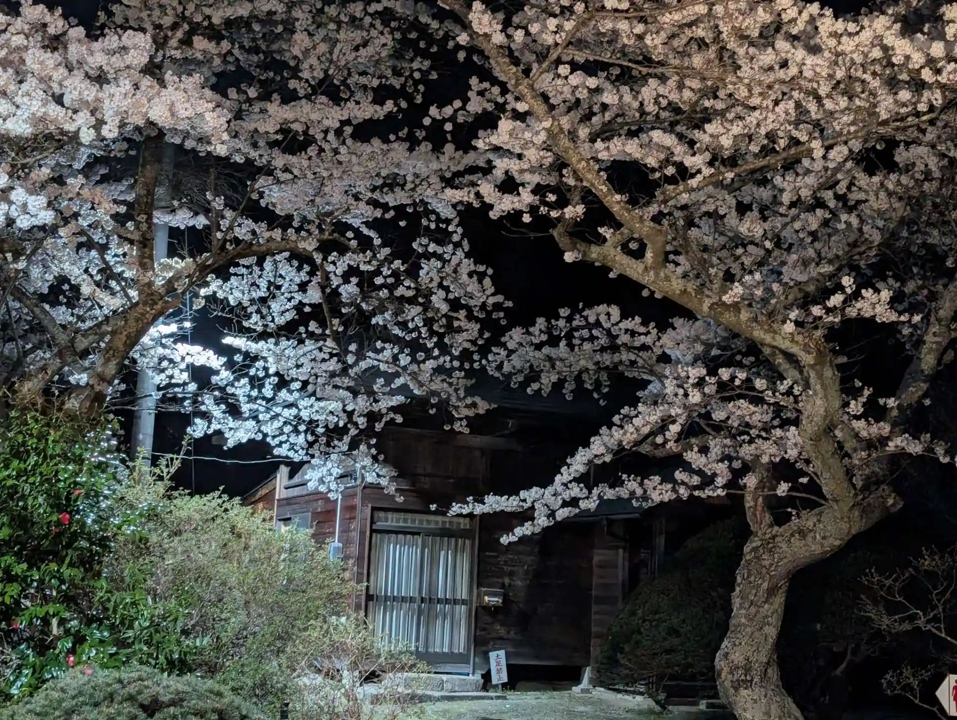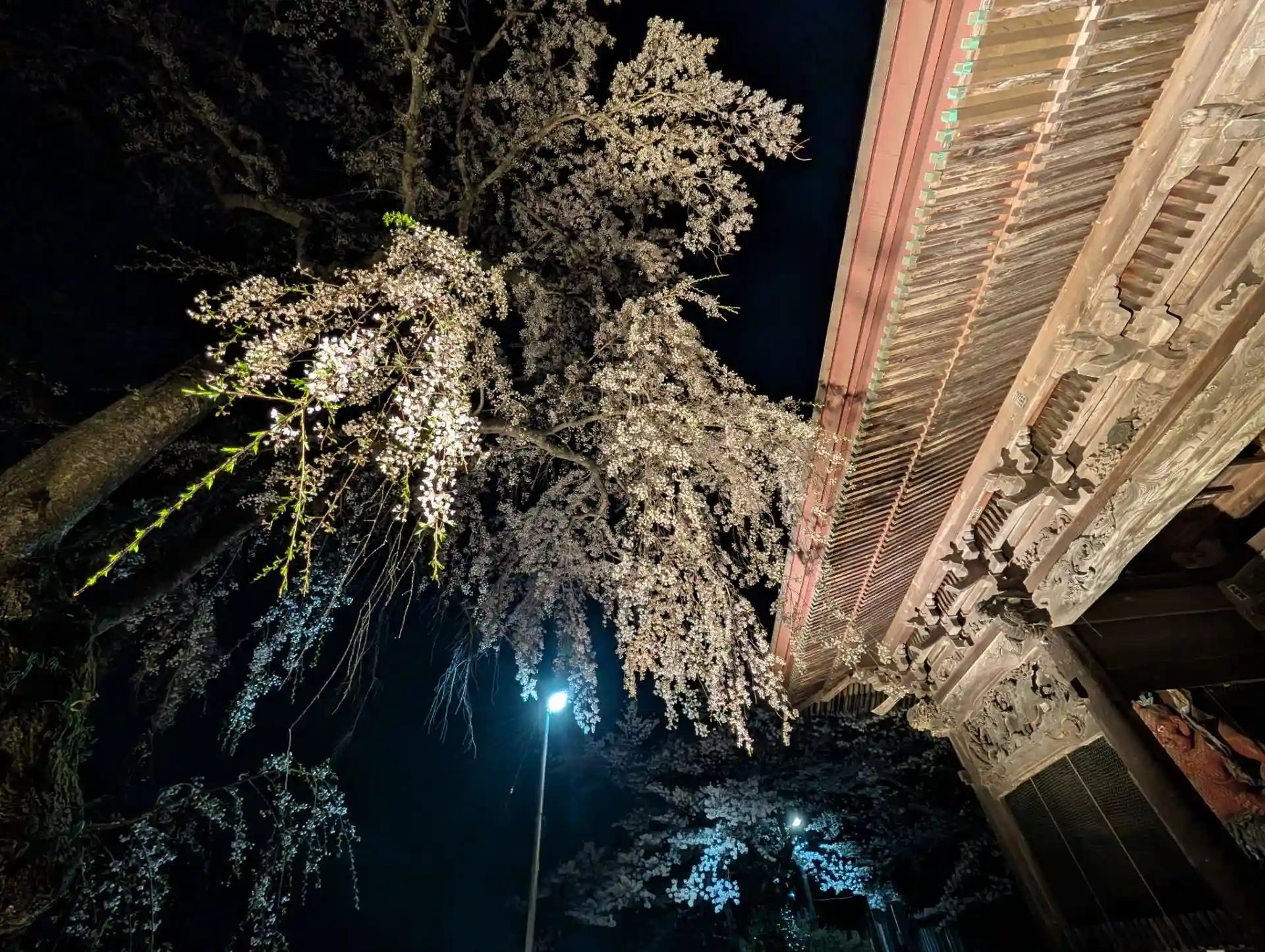 道路を挟んだ場所からも、美しい山門と桜が照らされています。