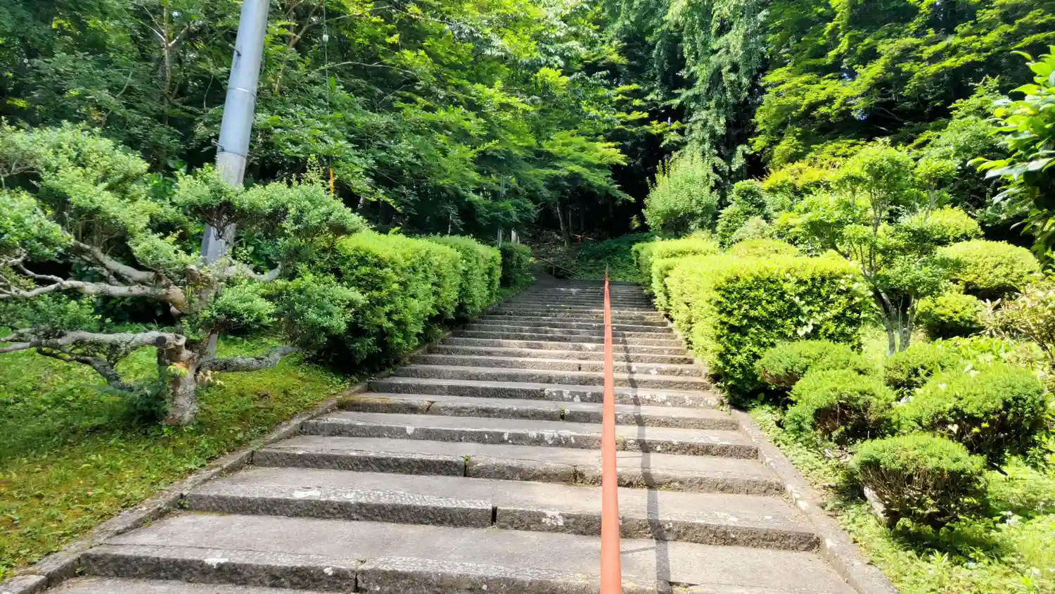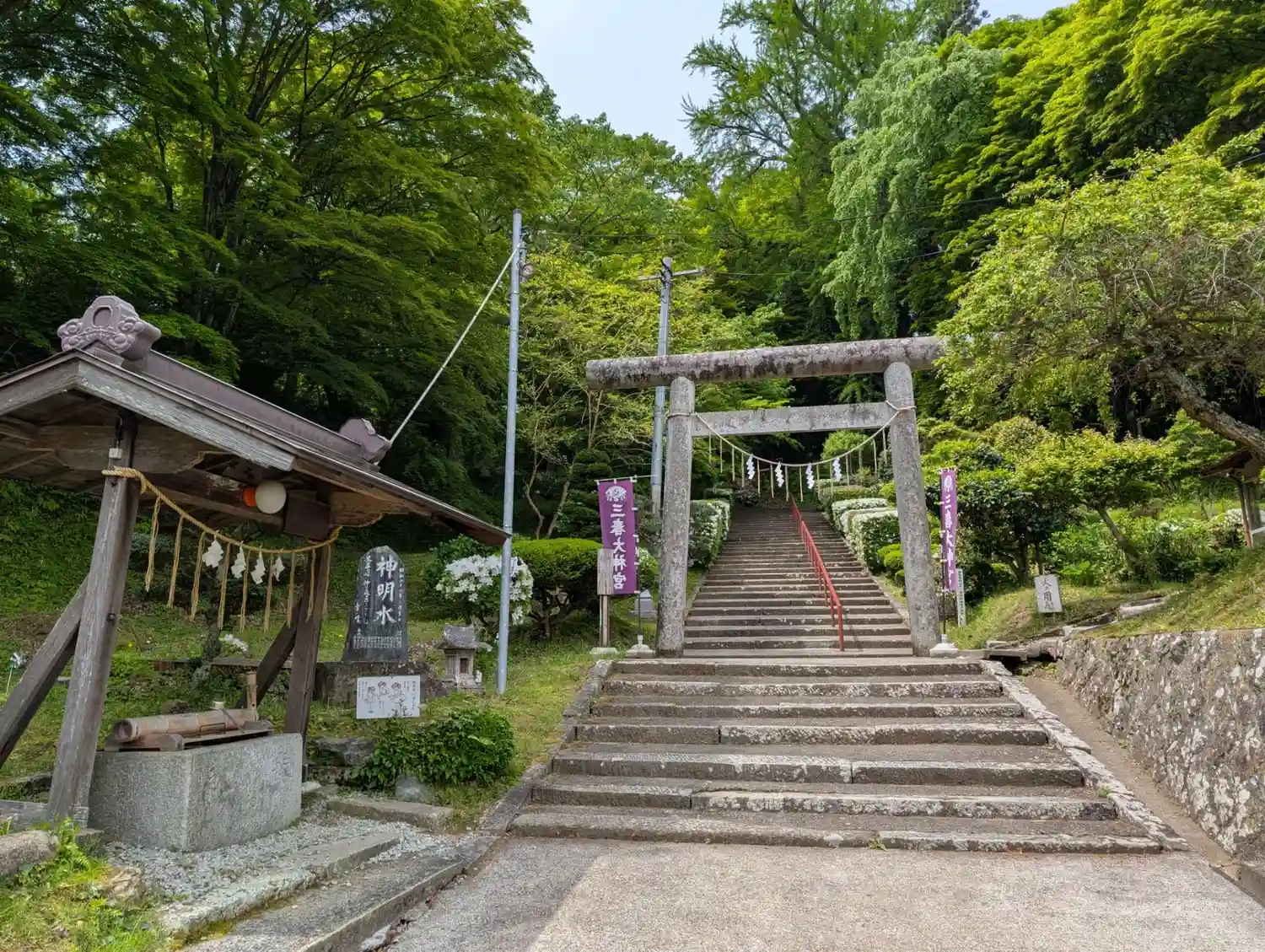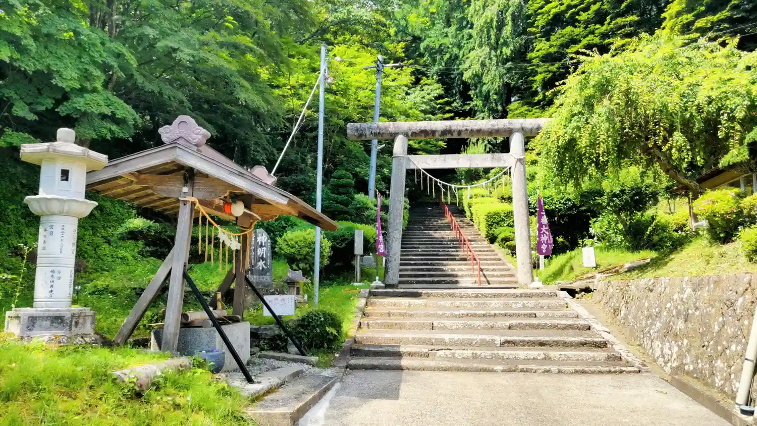 左手に手水舎があります。階段が曲がっていて先が見えません。