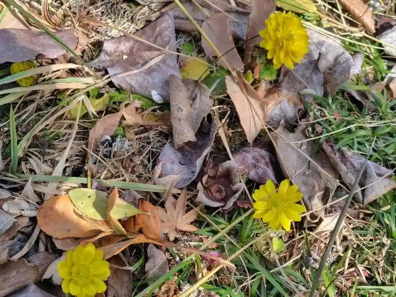 社務所周辺の福寿草が花盛りで…