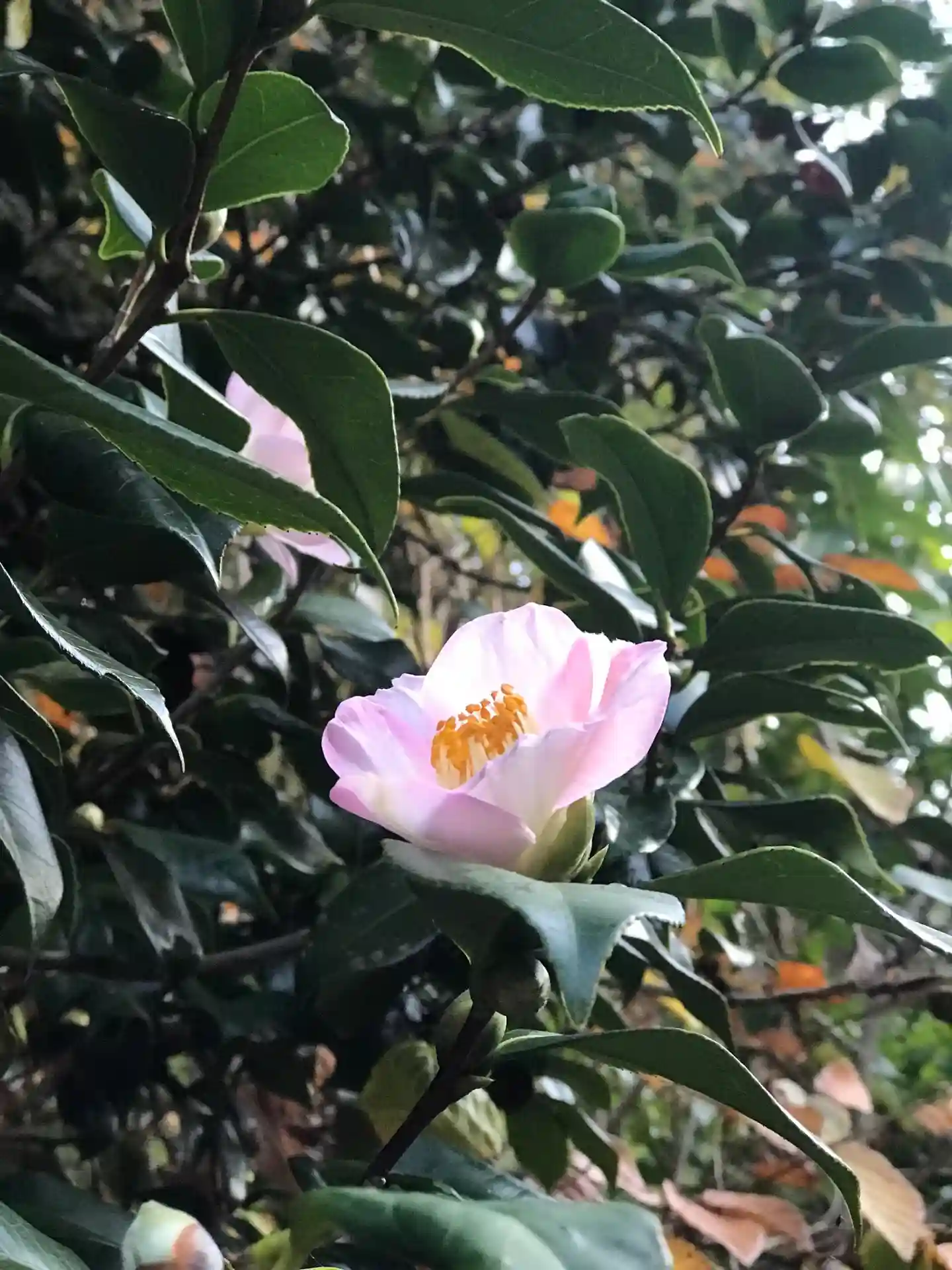 満開に咲く山茶花を一輪