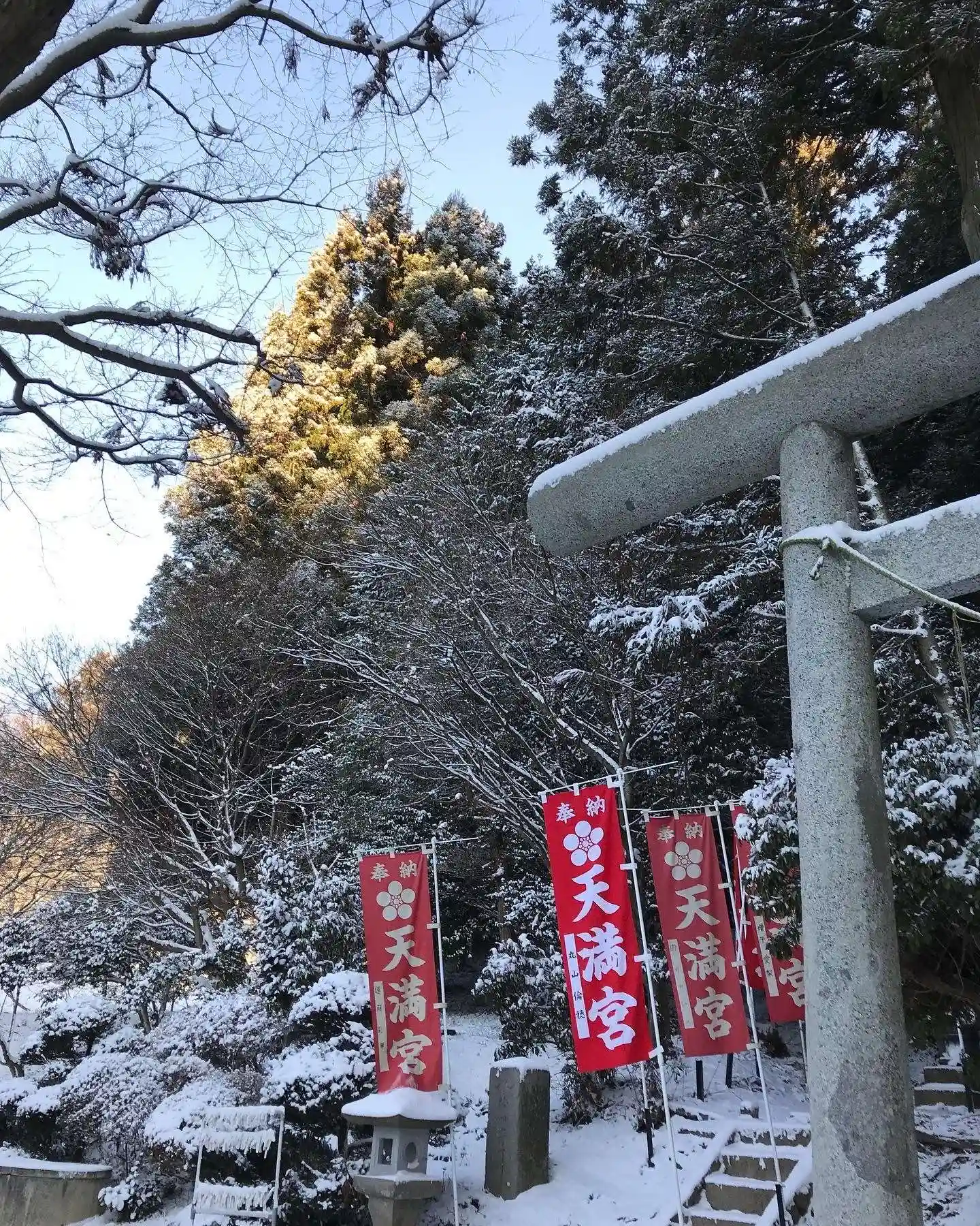 雪景色に天神さまの赤い旗が映えています
