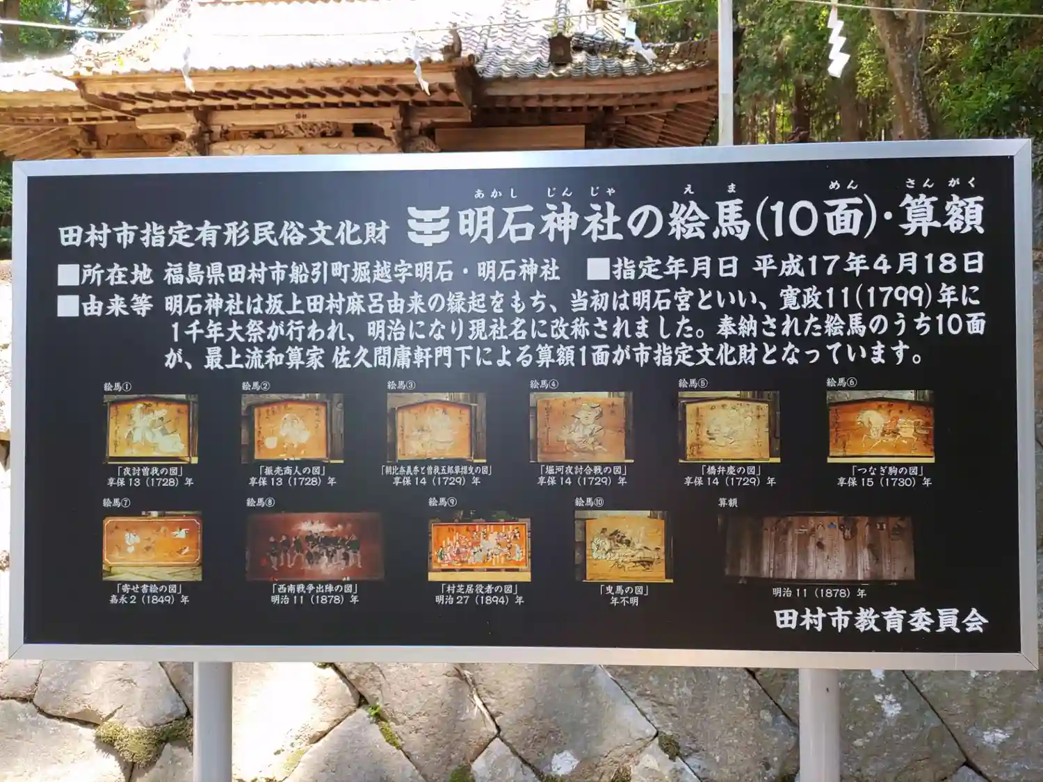 明石神社には、「お人形様」や「夜明かし石」(坂上田…